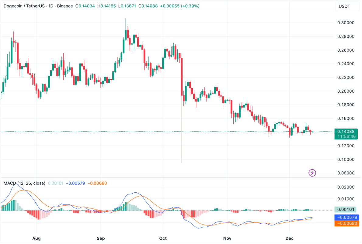 This structure is very critical. The emergence of a symmetrical triangle often indicates that Dogecoin has stopped its continued decline. This usually suggests that selling pressure is weakening, and the market is preparing for a possible directional breakout.