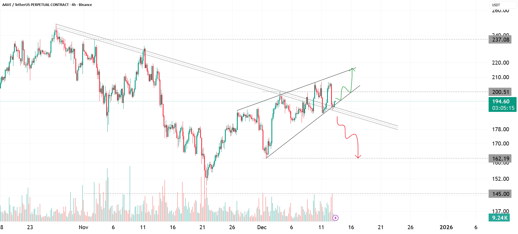 AAVE forms a clear ascending deposit structure after bouncing from the lower demand zone. The price is making higher highs and higher lows, but the range is tightening, indicating a loss of bullish momentum as it pushes towards the main downtrend line.