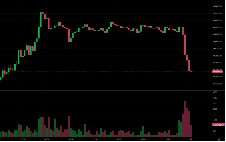 OKX data shows that at 22:55 Taiwan time last night, BTC suddenly entered a downward mode, directly breaking below the 90,000 dollar mark around midnight, completely reversing the gains from the previous day! Fortunately, it has now climbed back above 90,000, temporarily stabilizing its position.
