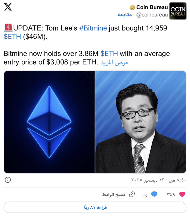 Bitmine, a digital currency company owned by Tom Lee, has made a decisive new move in the Ethereum market. The company recently acquired 14,959 ETH units worth nearly 46 million dollars, reinforcing its conviction for long-term holding. With this purchase, Bitmine's holdings of Ethereum exceeded 3.86 million ETH, making it one of the largest known holders of Ethereum.