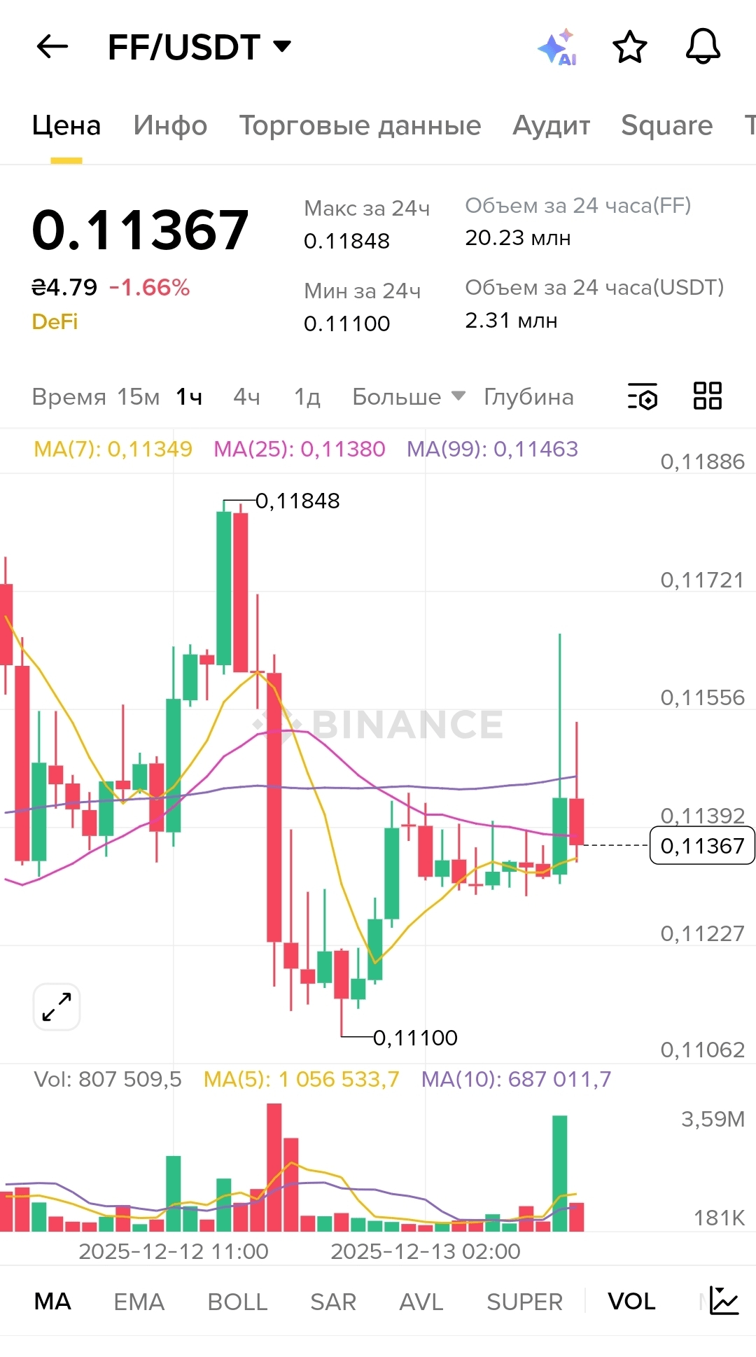 By the way, let's look at the real numbers. Right now, $FF is trading at 0.11367 USDT, and yes, over the last day the token has dropped by 1.66% — quite a normal correction for the crypto market. But pay attention to the volatility: in 24 hours, the price fluctuated from a low of 0.11100 to a high of 0.11848. That's a range of almost 7%, and this is where the charm of the collateral system comes into play. Imagine that you pledged $FF at a price of 0.11848 and received USDf. Even when the price fell to 0.11100, your collateral is still working because the over-collateralization covers these fluctuations. You did not lose your position, you were not liquidated, and when the price recovered to the current 0.11367, your assets are gaining value again.