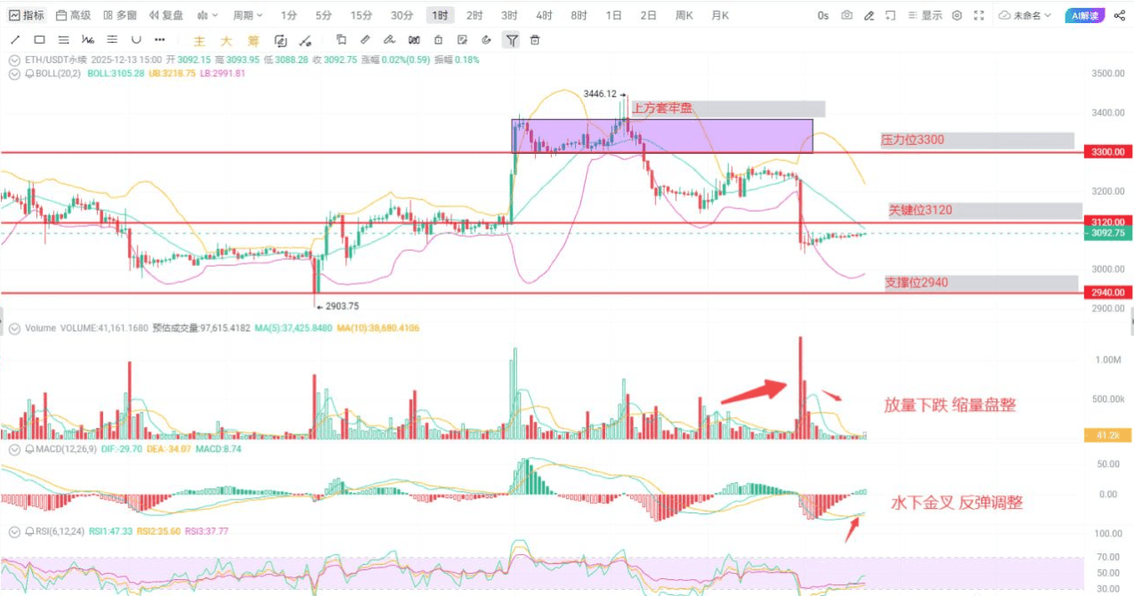 The Bollinger Bands directly reveal the essence: upper band 3103, lower band 2991, middle band 2921, the price is rubbing back and forth between the middle and upper bands, with signs of a short-term rebound, but the pressure is directly capped — 3120 is the first hurdle, 3300 is the strong pressure zone; the lower 2940 is the lifeline; if it breaks, it is likely to explore downwards further!
