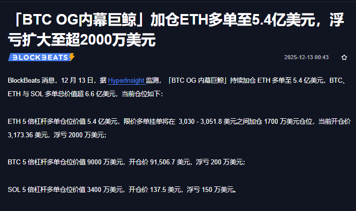 Exploding the crypto world! On December 13, did the 'BTC OG insider whale' go crazy? They splurged $540 million to increase their ETH long position, opening at $3173, and even with a current loss of over $20 million, they remain unfazed!