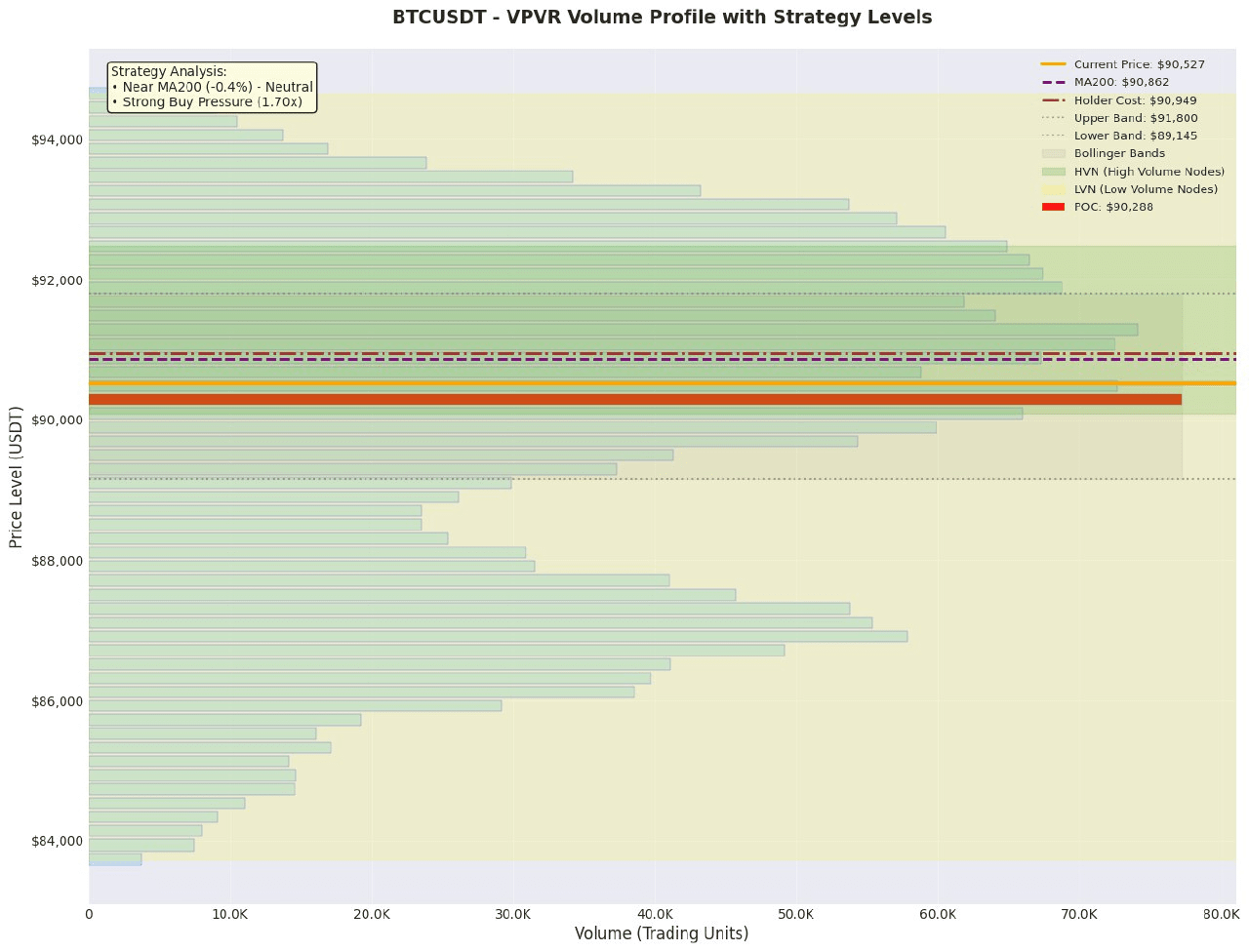 2. Trend and Volatility Range: The current price of 90527.49 is approximately 0.4% below MA200 (90862.44) and also below the cost of holding positions (90949.45), indicating a weak short-term market sentiment facing resistance from the medium to long-term trend line. The Bollinger Band range is from 89145.14 to 91799.76, with the current price at the 52.1 percentile, in a relatively strong oscillation range, with the lower bound of 89145.14 forming a key short-term support.