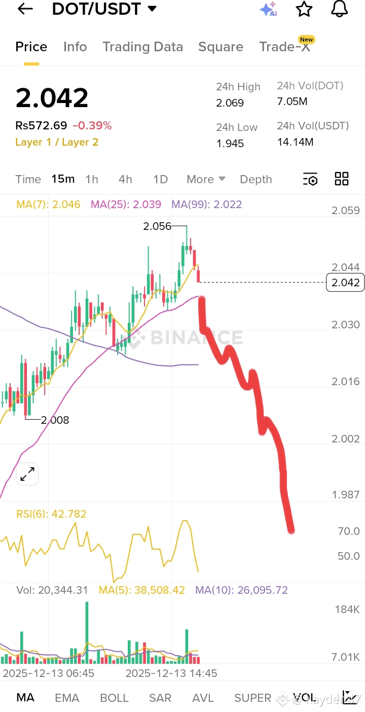 Based on the provided image, we can see the DOT/USDT trading pair on Binance using the 15-minute timeframe, and the market is currently showing clear bearish pressure. The current price is around 2.042 USDT, which is below the daily high of 2.069 USDT. This decline indicates that buying strength is weakening while sellers are gradually gaining control of the market.