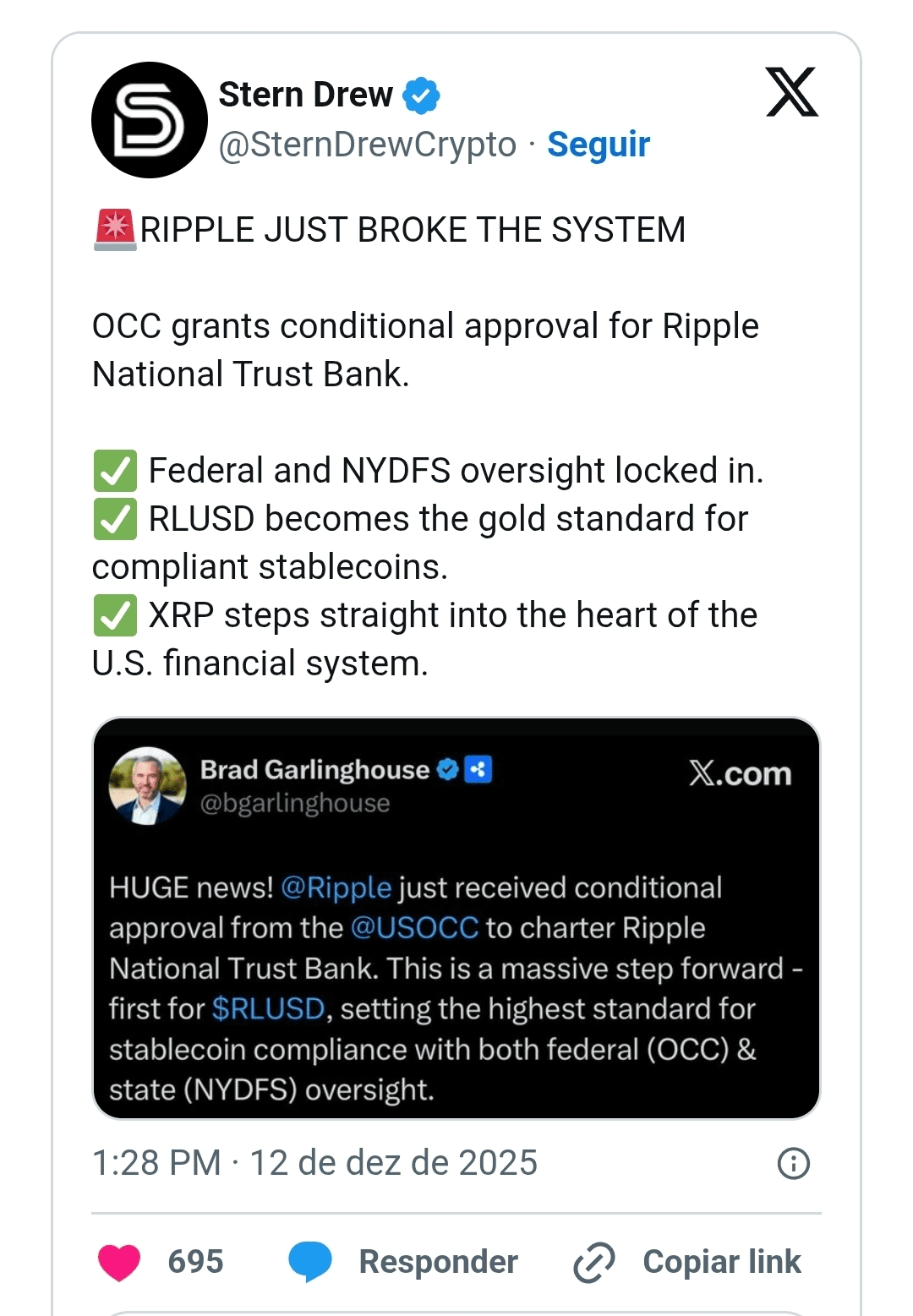 Stern Drew observed that the OCC's decision subjects Ripple to federal and New York state oversight, which strengthens the company's regulatory position. In his publication, he states that RLUSD, Ripple's stablecoin, now has a higher compliance standard. He also declared that the approval places XRP at the core of the U.S. financial system.