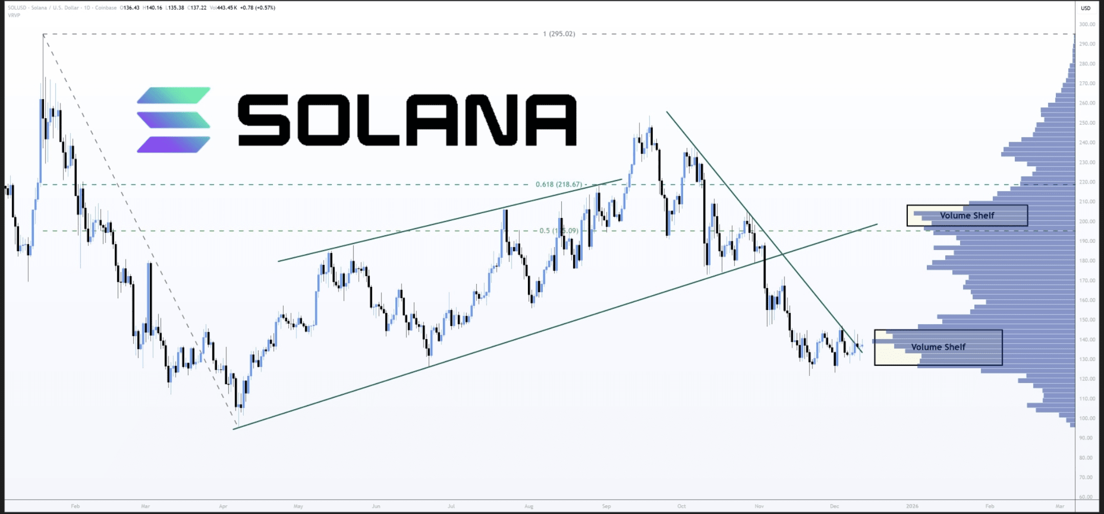 Solana (SOL) is currently trading within a market decision area based on high trading volume density (Volume Shelf).
