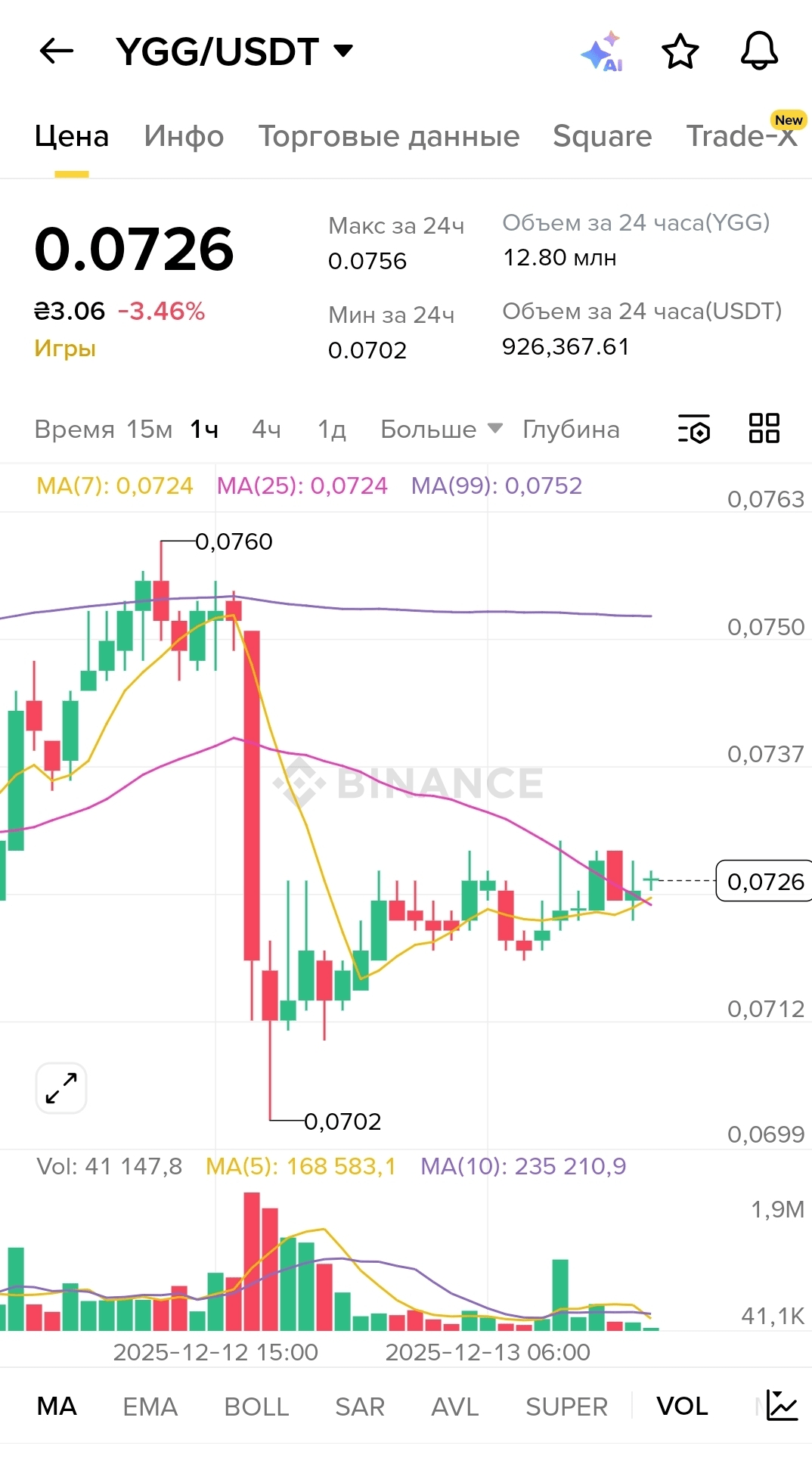 The first thing that stands out when you look at the chart of $YGG is the volatility. Right now, the token is trading at $0.0726, and over the past day it has dropped by 3.46%. But that's nothing compared to what I've seen before. Look at this chart — do you see that huge red candle when the price fell from $0.0760 almost to the minimum of $0.0702? That is a drop of almost 8% in a short period of time. And such movements are not uncommon here. I can go to sleep when my position is in the black and wake up with a loss of 20%. Or vice versa — but the stress from such swings is real. If you have weak nerves or need this money soon, it's better not to even think about investing in cryptocurrencies.