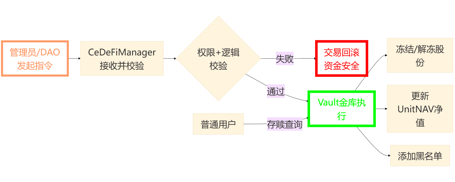 CeDeFiManager is responsible for 'administrative orders' and permission judgments, such as: creating new vaults, adjusting NAV, freezing suspicious shares.