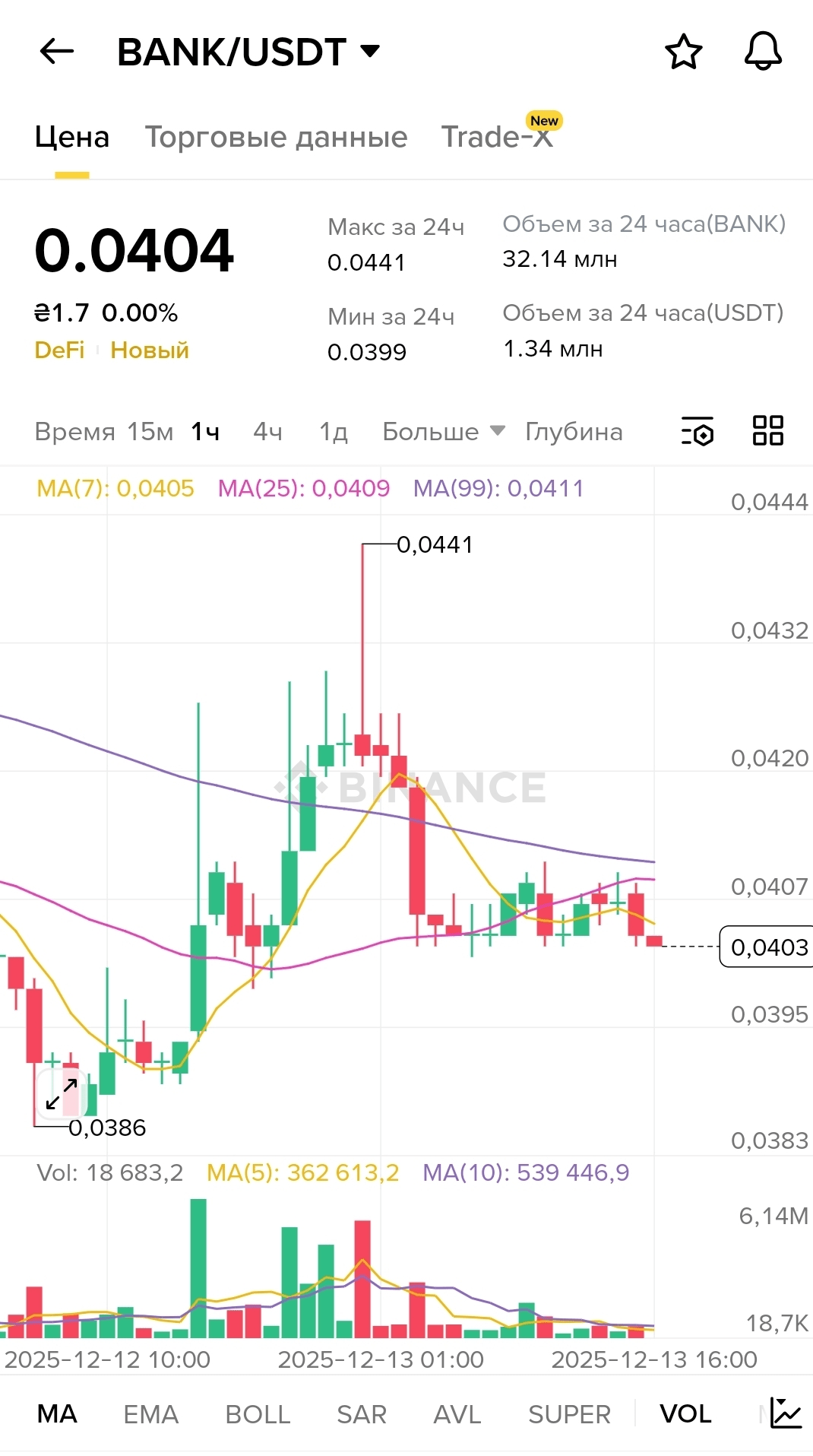 I'm currently looking at the chart $BANK and see a perfect illustration of liquidity and activity that make composability possible. The price is trading around $0.0404, staying virtually the same over the day — 0.00%. But don't let this stability fool you, because the history of recent days shows serious volatility. On December twelfth, there was a sharp spike to a maximum of $0.0441, followed by a pullback. Now the price is consolidating in a narrow range between $0.0399 (the minimum for 24 hours) and $0.0441 (the maximum). Do you see those small candles on the right of the chart? They form a tight sideways consolidation — the market is building strength before the next move.