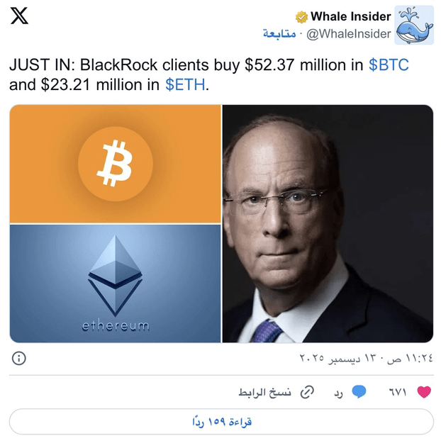 BlackRock clients added new capital to digital currency markets this week. On-chain data shows a flow of $52.37 million into Bitcoin, while at the same time, another $23.21 million moved into Ethereum. Purchases appeared in wallets linked to BlackRock's digital asset operations. Whale tracking data indicated that these movements represent new accumulation, not internal transfers.