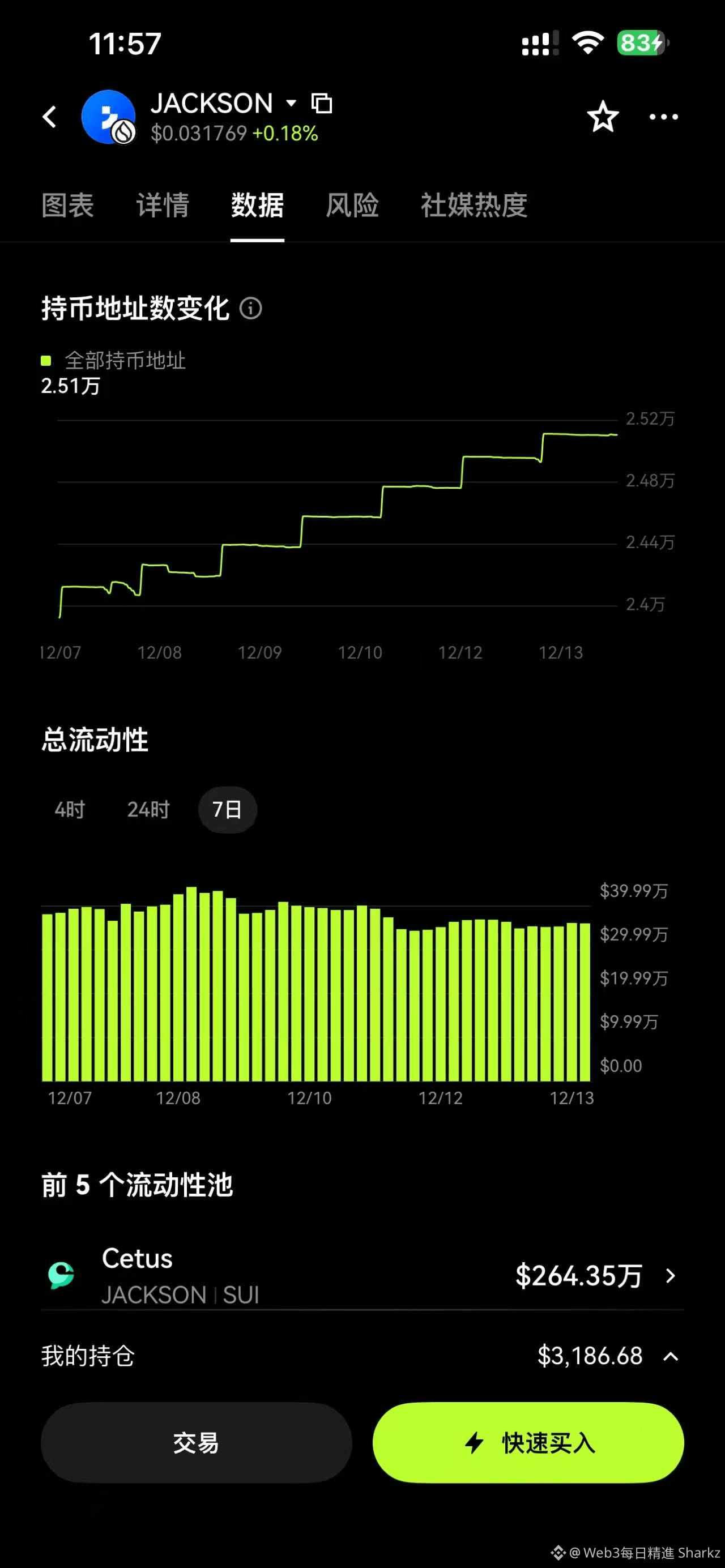 TGE至今(12/1-12/13):首日FDV $300.7M,价格从$0.01起飞,峰值$0.049+,当前$0.0317。日成交$229K,TVL快速破$7.5M+,社区氛围非常好,持币人数从2K增长到2.51万,只用了半个月不到。