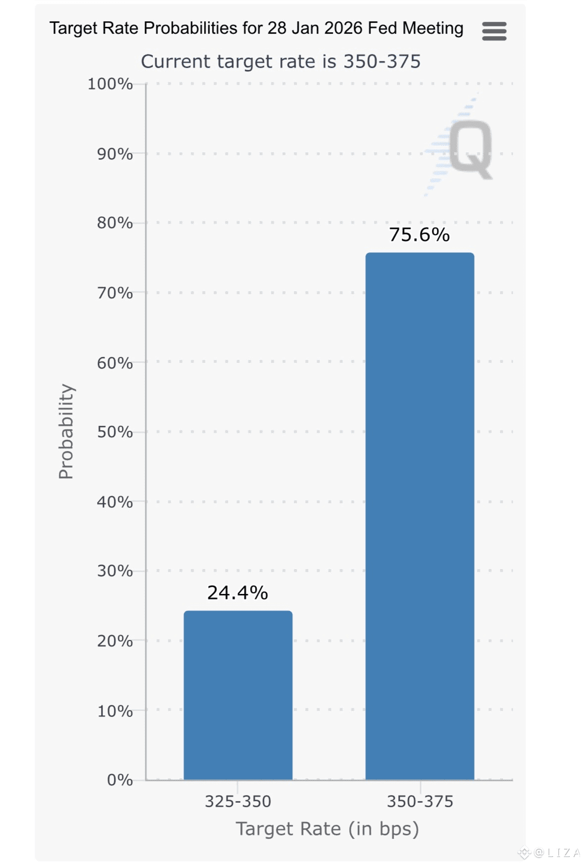 The U.S. Federal Reserve is sending a clear message: the era of easy rate cuts is on hold. According to the latest market pricing, there’s now only about a 24% chance of a rate cut in January, while the probability that rates remain unchanged sits above 75%.