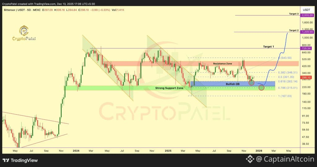 On the chart, the TAO price has now fallen back into an area where the market usually decides what comes next. This is the zone where strong trends either reload or break down completely.