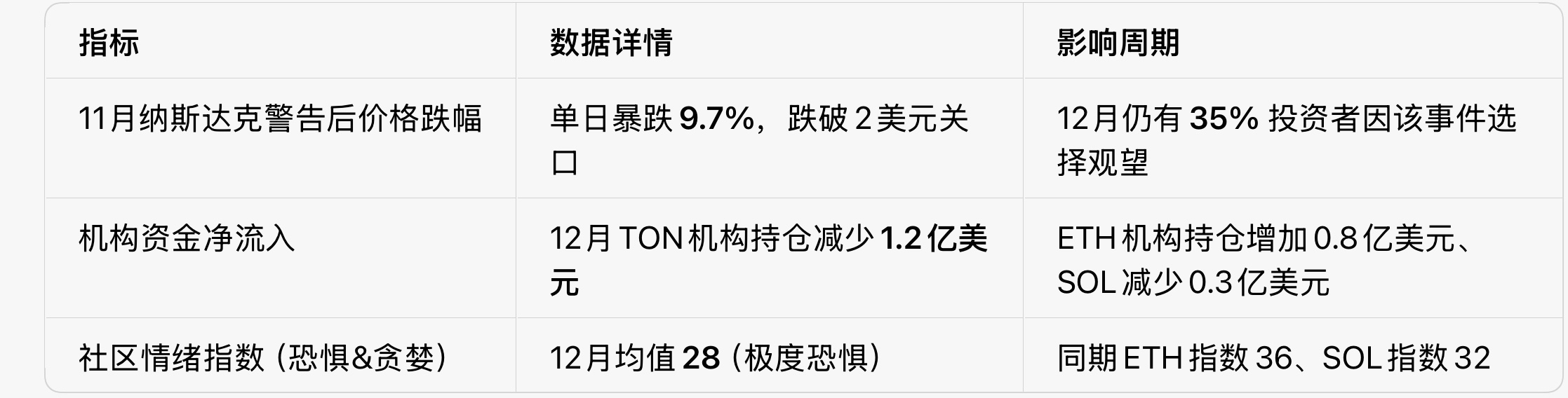 The trust crisis of TON in 2025 persisted from the beginning of the year to the end, with regulatory negativity and governance controversies continuously eroding market confidence. In November, Nasdaq condemned the 558 million dollar private placement transaction of TON Strategy Co., pointing out that it used nearly half of the funds to acquire TON without shareholder approval, violating equity issuance rules, directly triggering a single-day drop of over 5% in TON, breaking the key support level of 2.16 dollars. Although the exchange did not propose delisting, this incident raised doubts among institutional investors about its compliance, leading to a net outflow of over 120 million dollars in institutional funds throughout the year, becoming an important driver of the price decline.