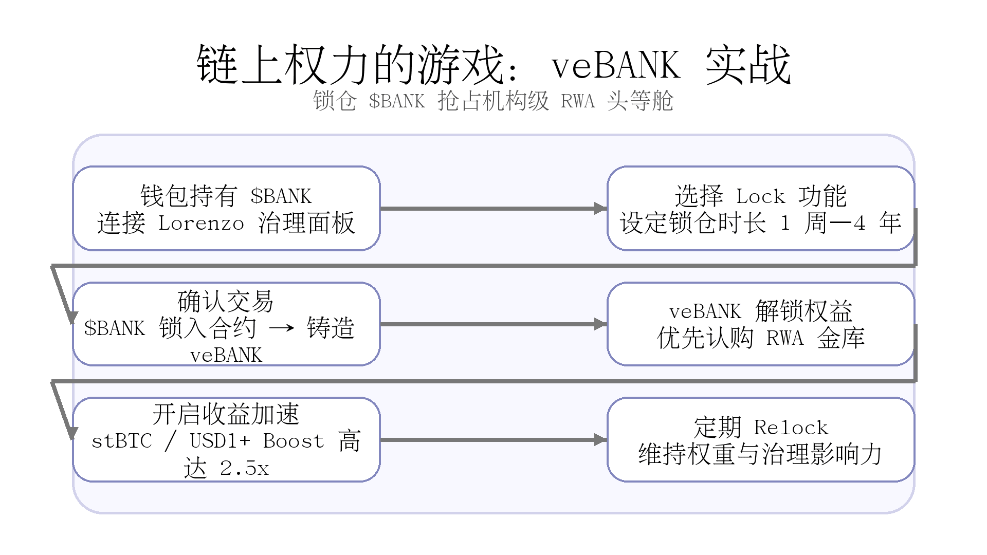 This diagram summarizes the main path from BANK → veBANK → multiple benefits in LorenzoProtocol: