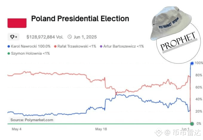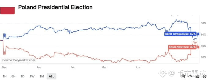 (在 Polymarket 的采访中 Prophet 也表示基于他“选民会支持一位右派领导人从而制衡左派执政”的观点,在赔率为 85%-15% 的时候认为 Nawrocki 应当有 30% 的概率,小仓位做多了 Nawrocki)第一轮之后的 5 月 25 日,Polymarket 上的赔率和波兰本地平台的赔率倒挂严重,进一步加仓 Nawrocki: