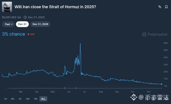 当以色列和伊朗交战时,人们的情绪被战争带来的悲痛和恐惧席卷,认为一切都很有可能发生,6 月中旬以色列对伊朗军事与核设施发起打击后,美方亦实施打击,风险溢价瞬间飙升。高盛在 6/23 的报告里甚至引用 Polymarket 的数据称“2025 年关海峡的概率 52%”,路透社也有类似的概率报道,市场的情绪被迅速点燃。