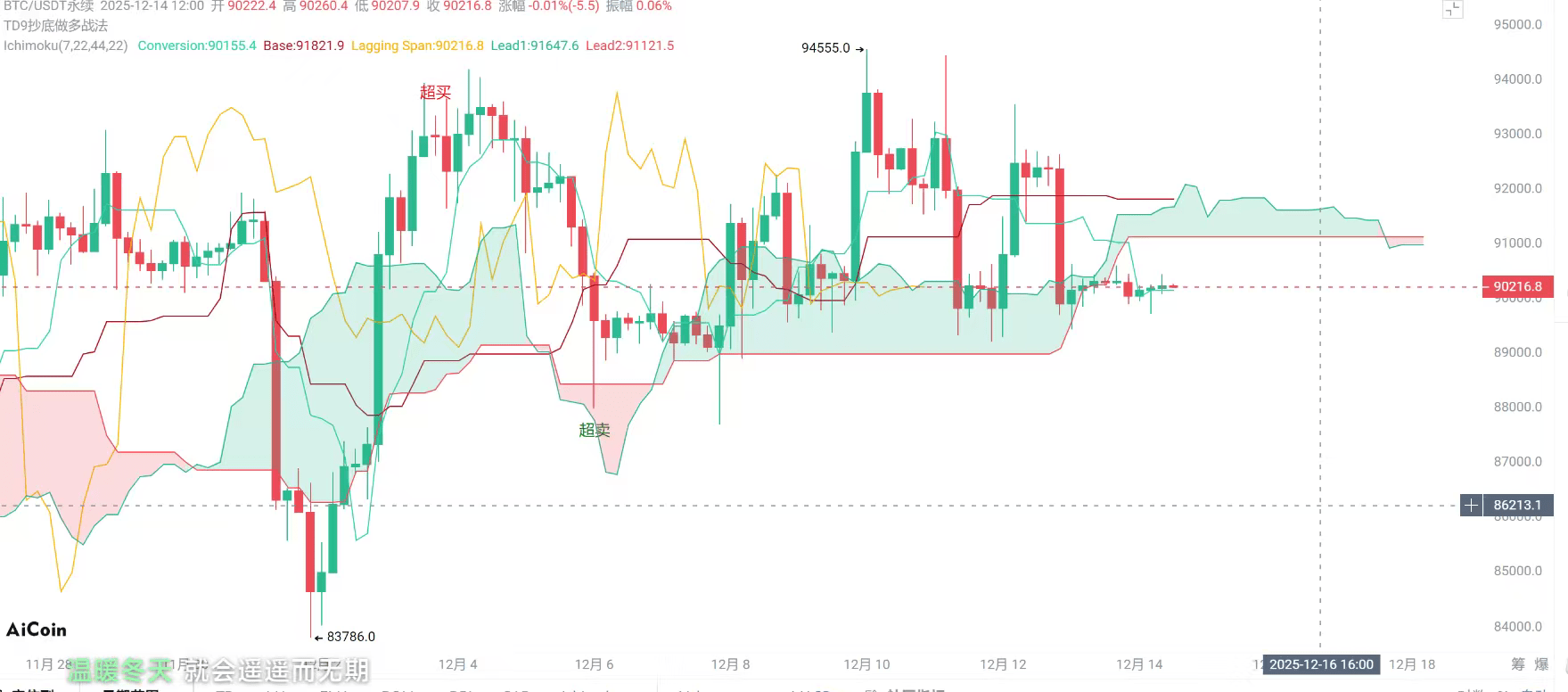 At the four-hour level: Although it is a bullish cloud in the short term, the upper edge of the cloud at 91,100 USD and the baseline at 91,800 USD together form the first firewall for rebounds.
