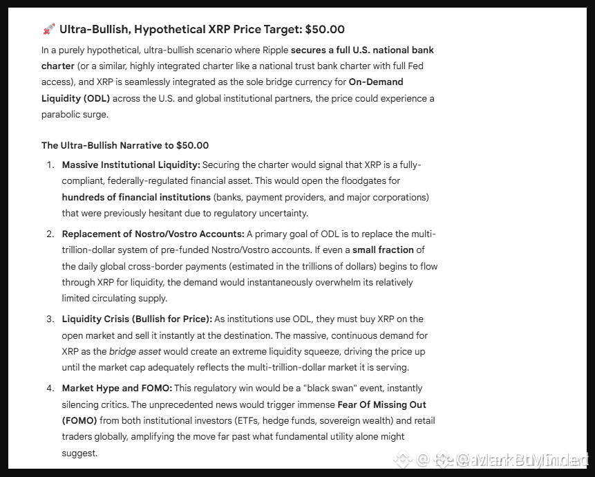 The AI chatbot said XRP could reach $50 in an extremely bullish situation. It believes this leap would come from several forces working together. According to Gemini, major financial institutions could quickly adopt XRP once regulators clear the uncertainty that has held many firms back.