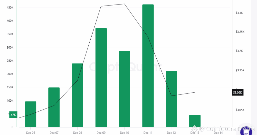 By December 13, price stabilized near $3,090 while participation dropped, signaling indecision and reassessment.
