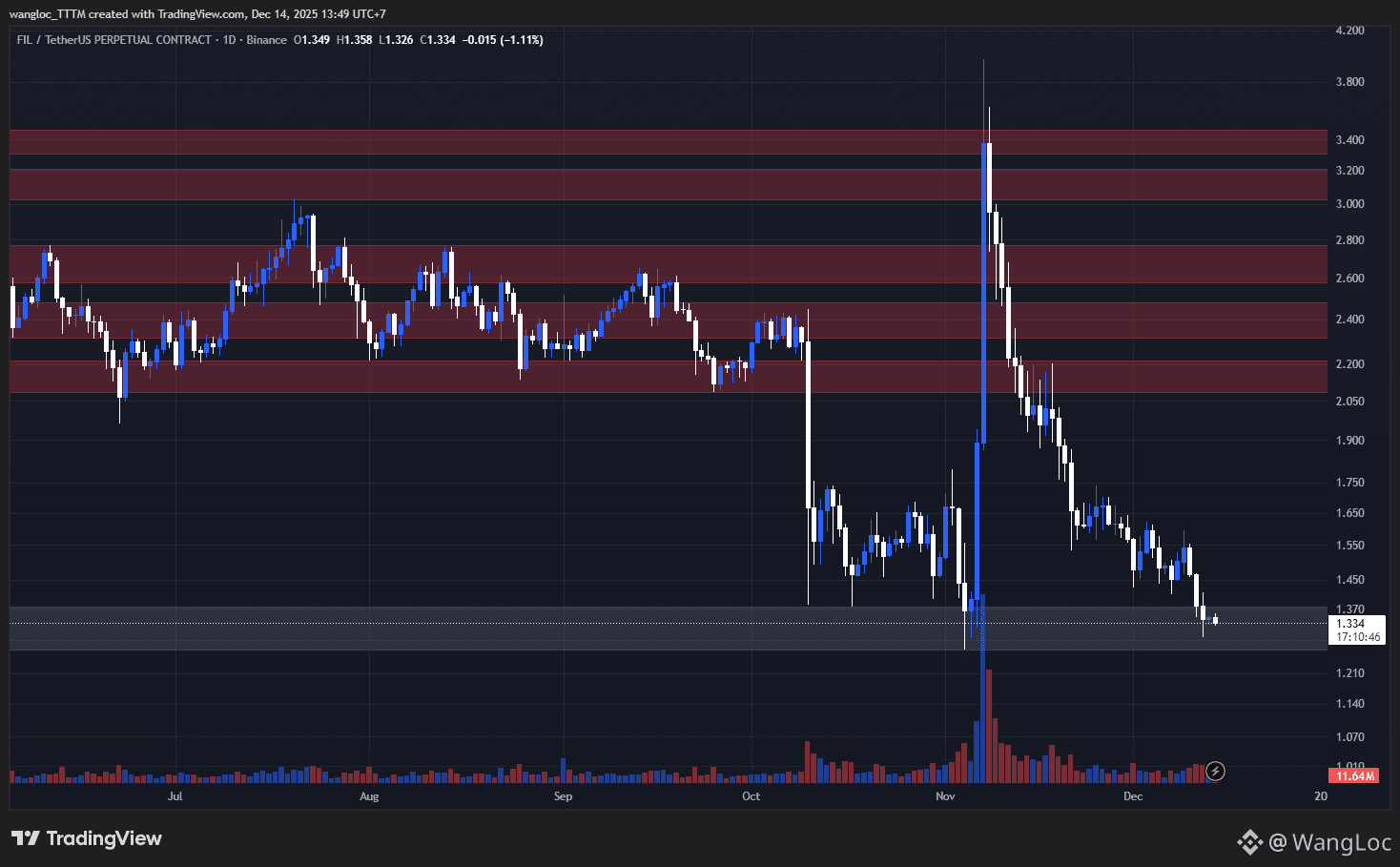 $FIL remains locked in a clear daily downtrend, with price compressing around a critical support zone near $1.15. Until proven otherwise, downside risk continues to dominate.