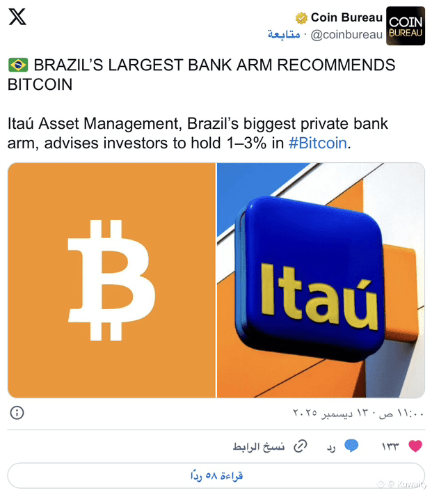 لقد أضافت وحدة إدارة الأصول في بنك إيتاú دفعة إضافية لهذا الاتجاه. كذراع إدارة الأصول لأكبر بنك خاص في البرازيل، بدأت إيتاú توصي بتخصيص نسبة تتراوح بين 1 و3٪ من المحفظة في البيتكوين. تُظهر هذه التوصية مستوى متزايدًا من الثقة بين المؤسسات المالية المحافظة في إمكانات البيتكوين لإدراجه ضمن المحفظة الاستثمارية.