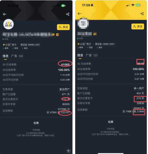One thing to note when selecting merchants is that you must look at the total transaction volume and the transaction volume in the last 30 days. What does this mean? For example, if a merchant has an old account registered for one year, and their transaction volume in the last 30 days is more than 80% of their total transaction volume, this could also be a deliberately maintained account. You must filter for accounts that have been registered for a long time, have a large number of transactions, and maintain a consistent transaction volume every month. Both buying and selling volumes need to be considered. See the picture below.