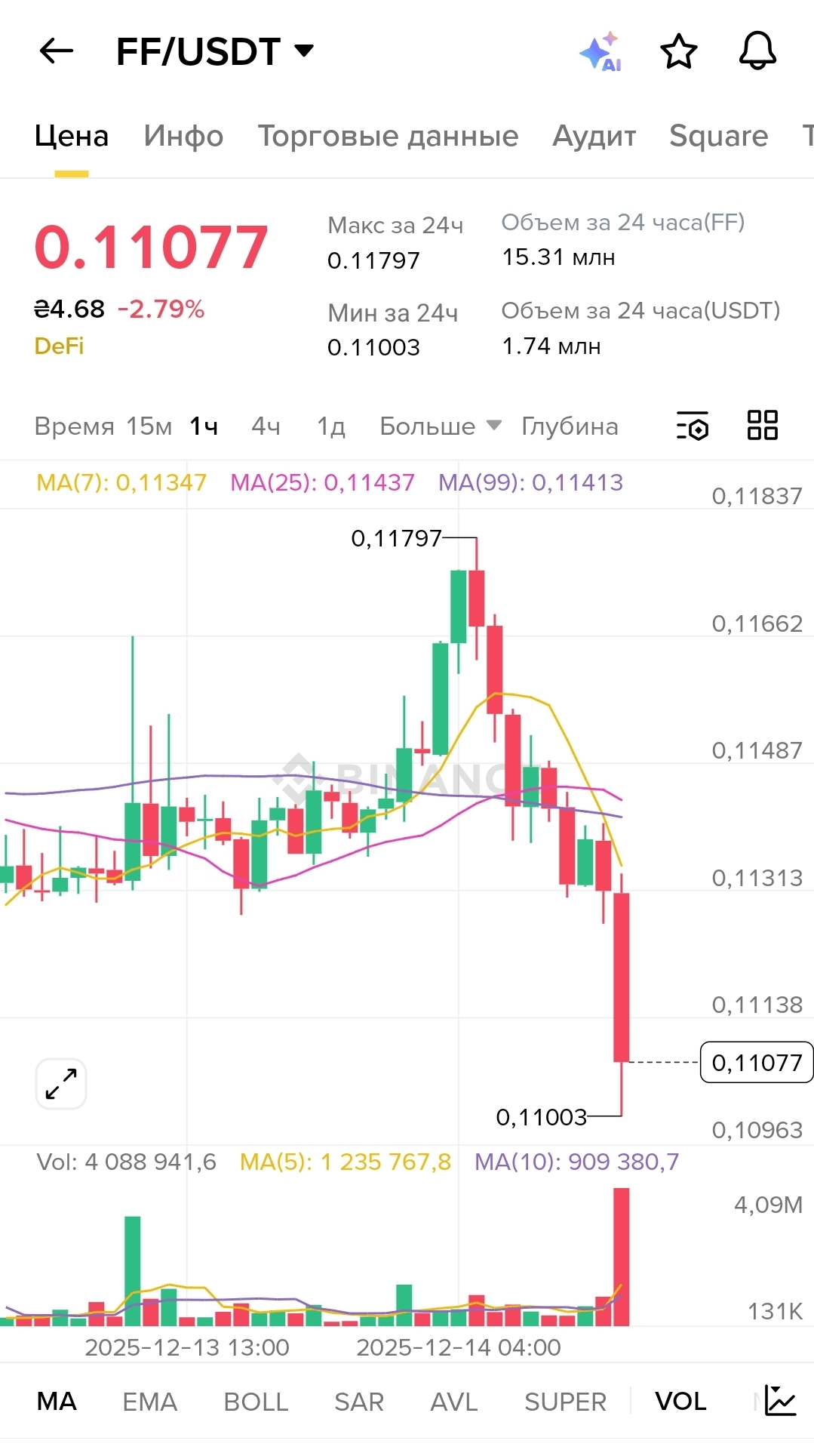 Let's take an example. Suppose I have a portfolio: 50% in $FF, 30% in more stable tokens, 20% in tokenized real-world assets. The volatility $FF is high — we see this on the chart, where MA(7) is at 0.11347, MA(25) — 0.11437, MA(99) — 0.11413, and they are all located close to each other, indicating a period of consolidation after sharp movements. But the stable part of the portfolio compensates for these fluctuations. As a result, I do not need to hold 200% collateral — 140-150% is sufficient, and I already get much more liquidity for every dollar invested.