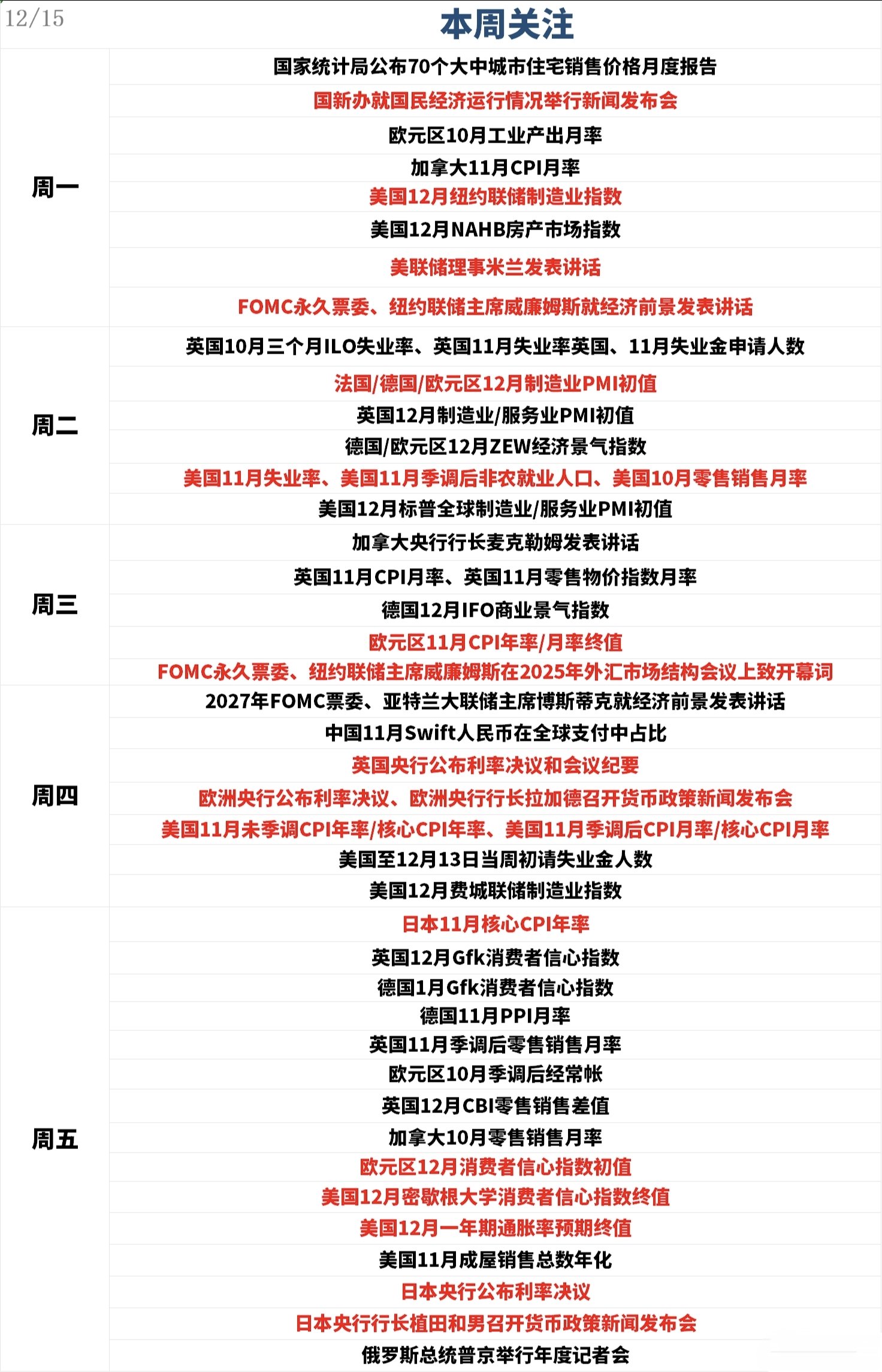 CPI data (Thursday): The unadjusted CPI and core CPI data for November are core indicators for judging the inflation trend in the US. If inflation continues to retreat, it will further solidify expectations for rate cuts, putting the dollar's lifeline to a substantive test, and gold and silver are expected to break through key resistance; if inflation rebounds, the dollar index may experience a rebound, while gold and silver may enter a correction.