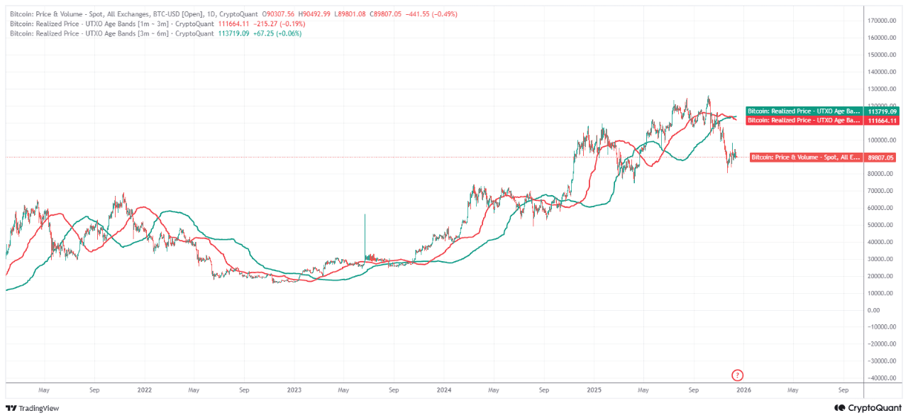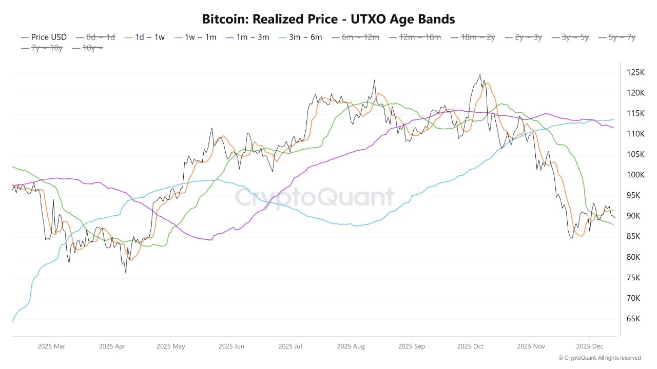 One of the most significant signals in the Bitcoin chain today comes from realized price data rather than actions on the spot price. Analyzing more than 3,200 daily observations of the realized price of Bitcoin in UTXO age groups reveals a consistent pattern where the realized price of the 1–3 month group falls below that of the 3–6 month group. Under normal market conditions, new buyers pay more than medium-term holders. In fact, the average gap between these two groups is approximately +$2,500. When this ratio inverts, it indicates a statistically unusual regime.