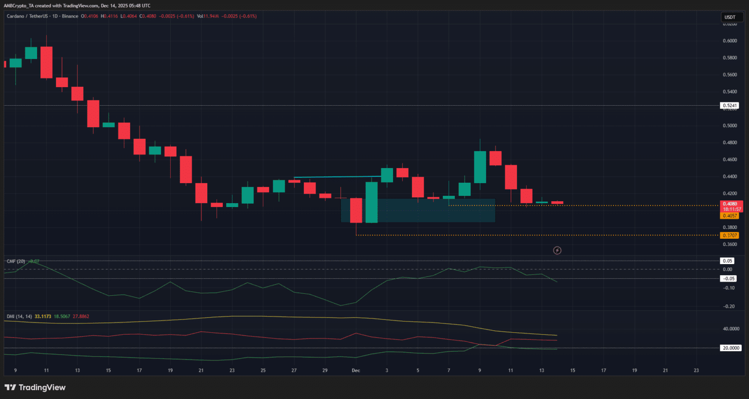 A week before December 8, ADA came from a low of $0.37 and shot up a brutal 30.6% to $0.484. Up like a rocket! 🚀 But there, at $0.484, the party ended. The bulls (those who want it to rise) did not have the strength to break a key long-term resistance at $0.52. This tells us something important: that bullish strength was not as reliable as it seemed. There simply weren't enough people putting in money with conviction.