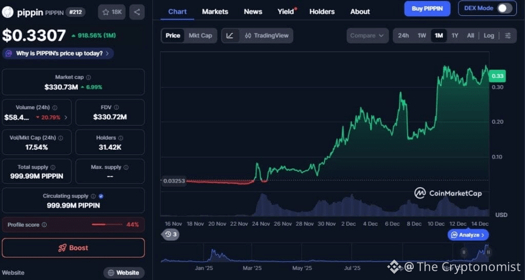 Swing trading activity around $PIPPIN has highlighted its volatility, with rapid price swings providing opportunities for strategic entry and exit points. Its market cap has surged dramatically in recent weeks, reflecting growing interest despite minimal social media activity.