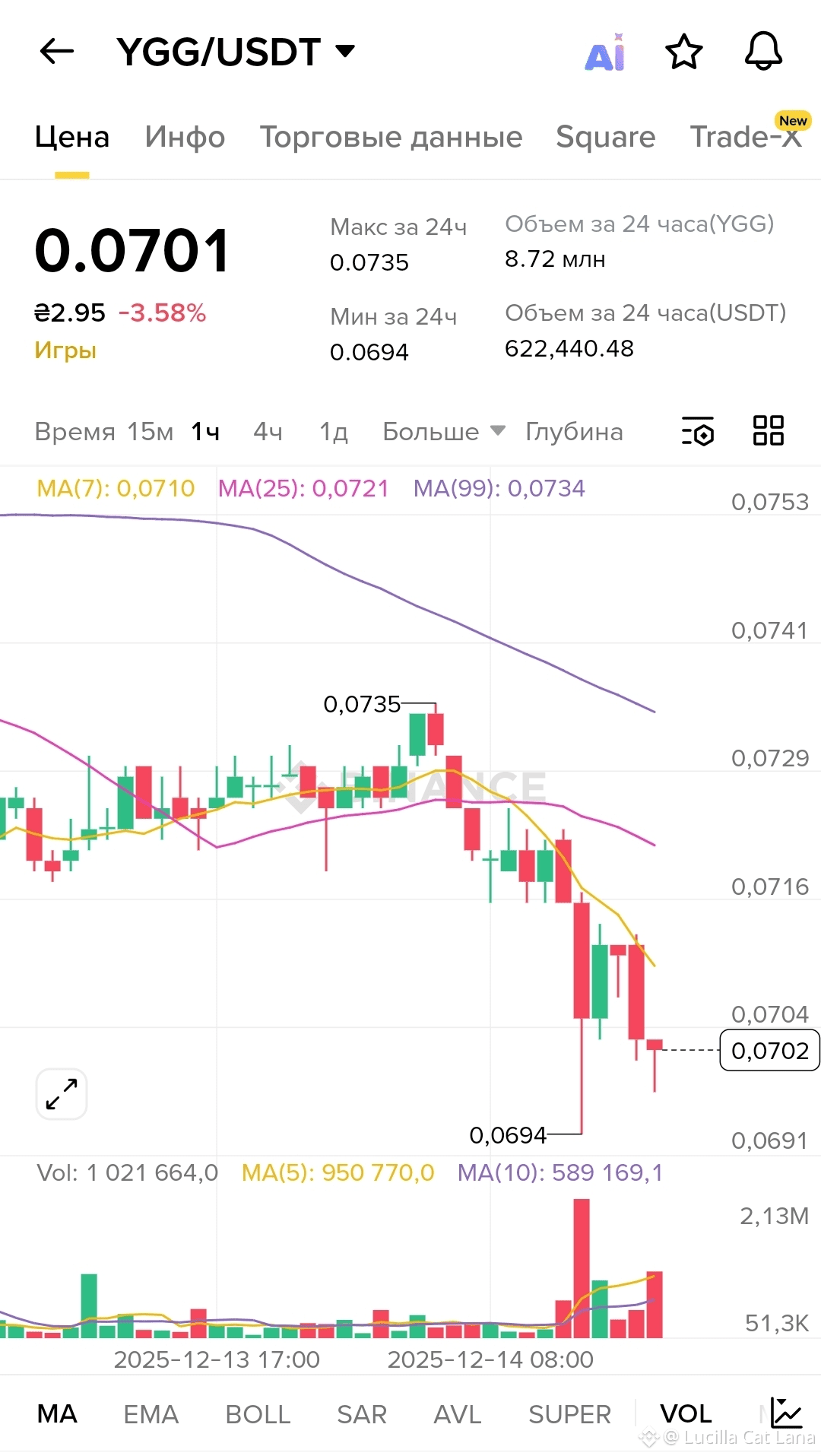 Честно говоря, когда я впервые открыла график $YGG сегодня утром, у меня сердце ушло в пятки. Цена $0.0701 с падением на 3.58% — это больно. Особенно когда видишь, как токен рухнул с максимума $0.0735 до минимума $0.0694 всего за сутки. Это падение почти на 6%, и смотреть на эту красную свечу справа на графике физически неприятно. Все скользящие средние — MA(7) на $0.0710, MA(25) на $0.0721, MA(99) на $0.0734 — находятся выше цены. Технически это классический нисходящий тренд, и мой внутренний трейдер кричит "продавай!". Но знаете что? Я не продаю. Потому что я понимаю, что стоит за этим токеном — массивный портфель NFT-активов, которые @YieldGuildGames накопила за годы работы. И сегодня хочу рассказать, почему эти цифровые картинки и виртуальные земли имеют реальную ценность и почему я все еще верю в долгосрочный потенциал проекта, несмотря на сегодняшнее падение.