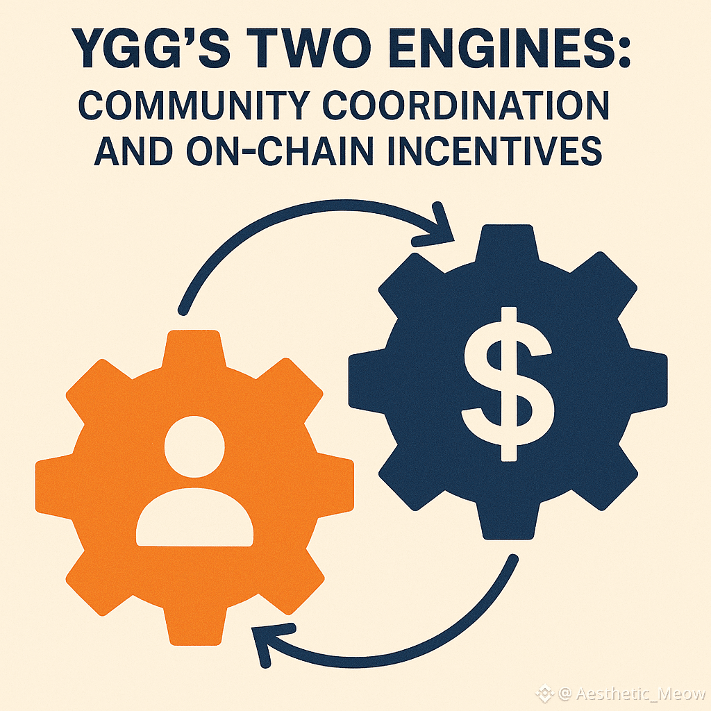 Most systems in Web3 focus on one engine while downplaying the other. They either become entirely social – lots of community energy, little structure – or purely mechanical – clear incentives, weak human connection. YGG’s more significant idea is that a guild needs both, and in a specific order. Community coordination is the first engine; it’s what makes participation cohesive. On-chain incentives are the second engine; they help that cohesion last through time, scale, and market ups and downs.