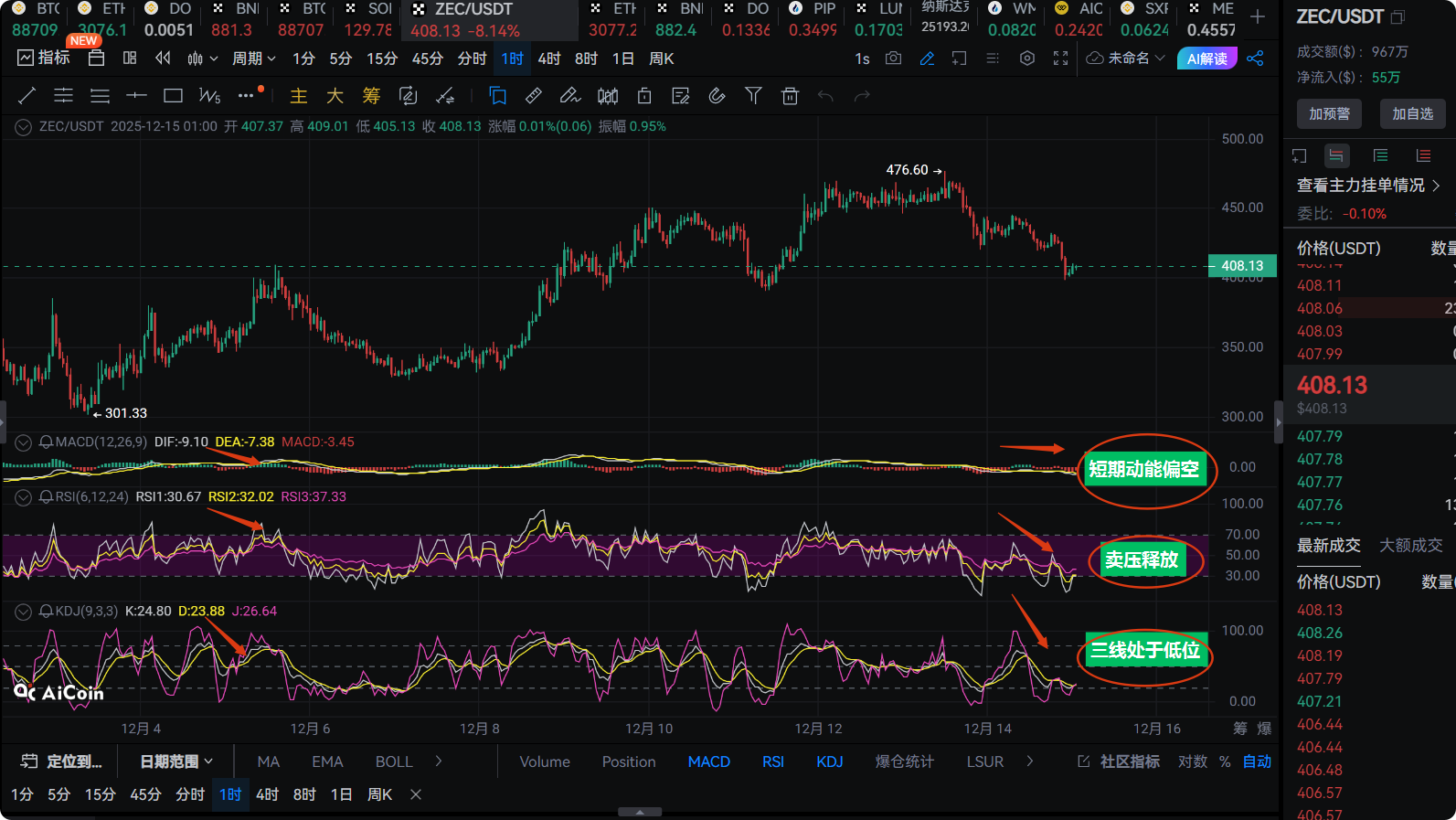 Look at that pile of indicators on the chart: MACD green bars shrink like toothpicks, DIF and DEA are still lying below the zero axis, but the strength of the 'death cross turning' has weakened; RSI rebounded after touching the 30 oversold line, and KDJ's three lines are sticking together around 25 — this is not a signal of 'going down,' but a clear sign that 'bears can't push down anymore.' Just like last month when Arkham said they could unveil ZEC's anonymous trading, many shouted 'big zero coin is going to die,' but what happened? The price fell from 750 to 400 and then stopped, and institutions like Cypherpunk took the opportunity to increase their positions; now that pullback looks like a 'golden pit.' Today's trend follows the same logic as 'bad news hitting the bottom.'