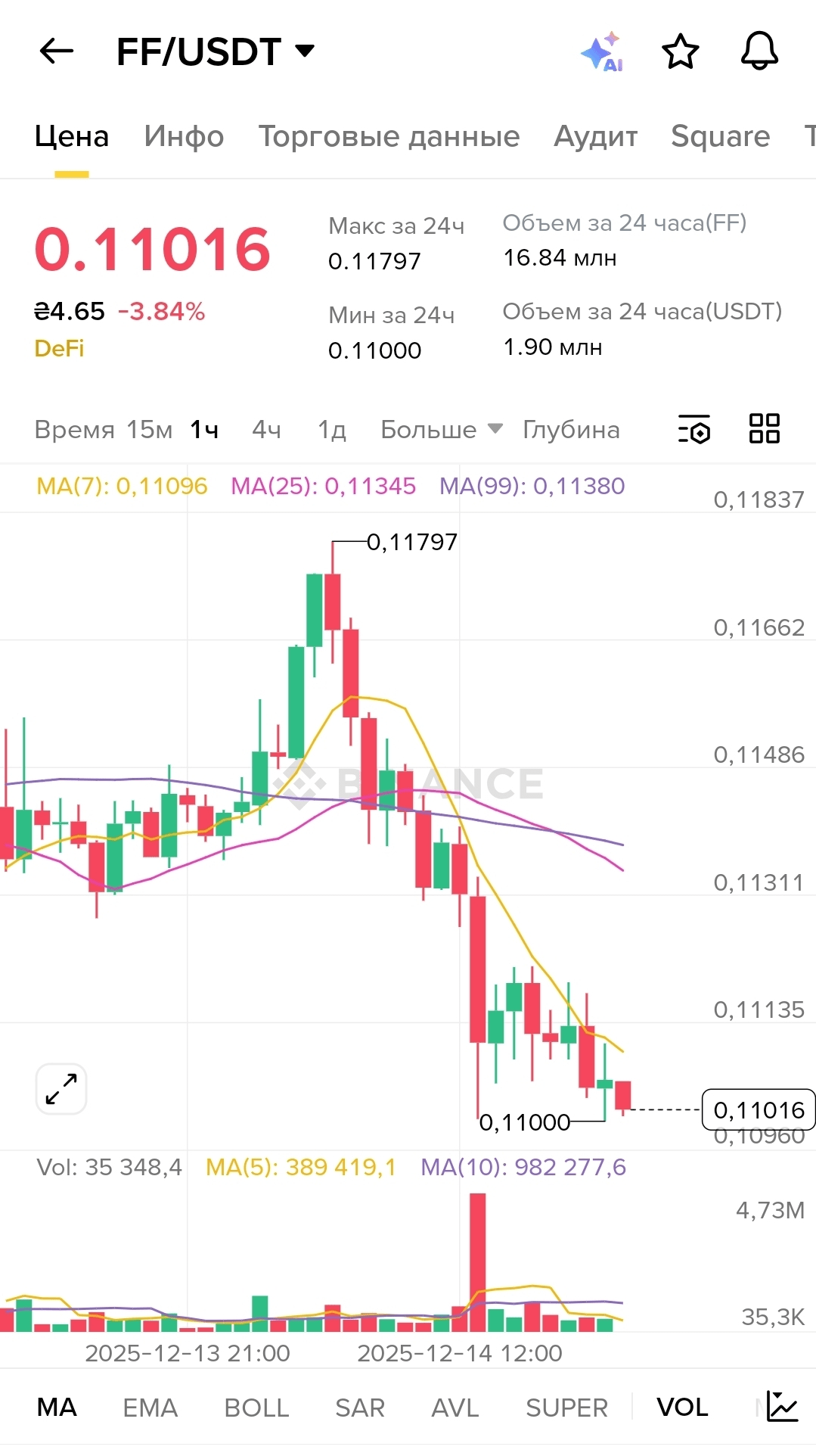 Look at the chart — MA(7) at 0.11096, MA(25) — 0.11345, MA(99) — 0.11380. The short-term average is significantly below the long-term ones, indicating a downtrend. If you practice DCA and buy the asset regularly, such dips are a gift because you are averaging the entry price. And thanks to USDf, you can do this without touching your main savings in crypto.