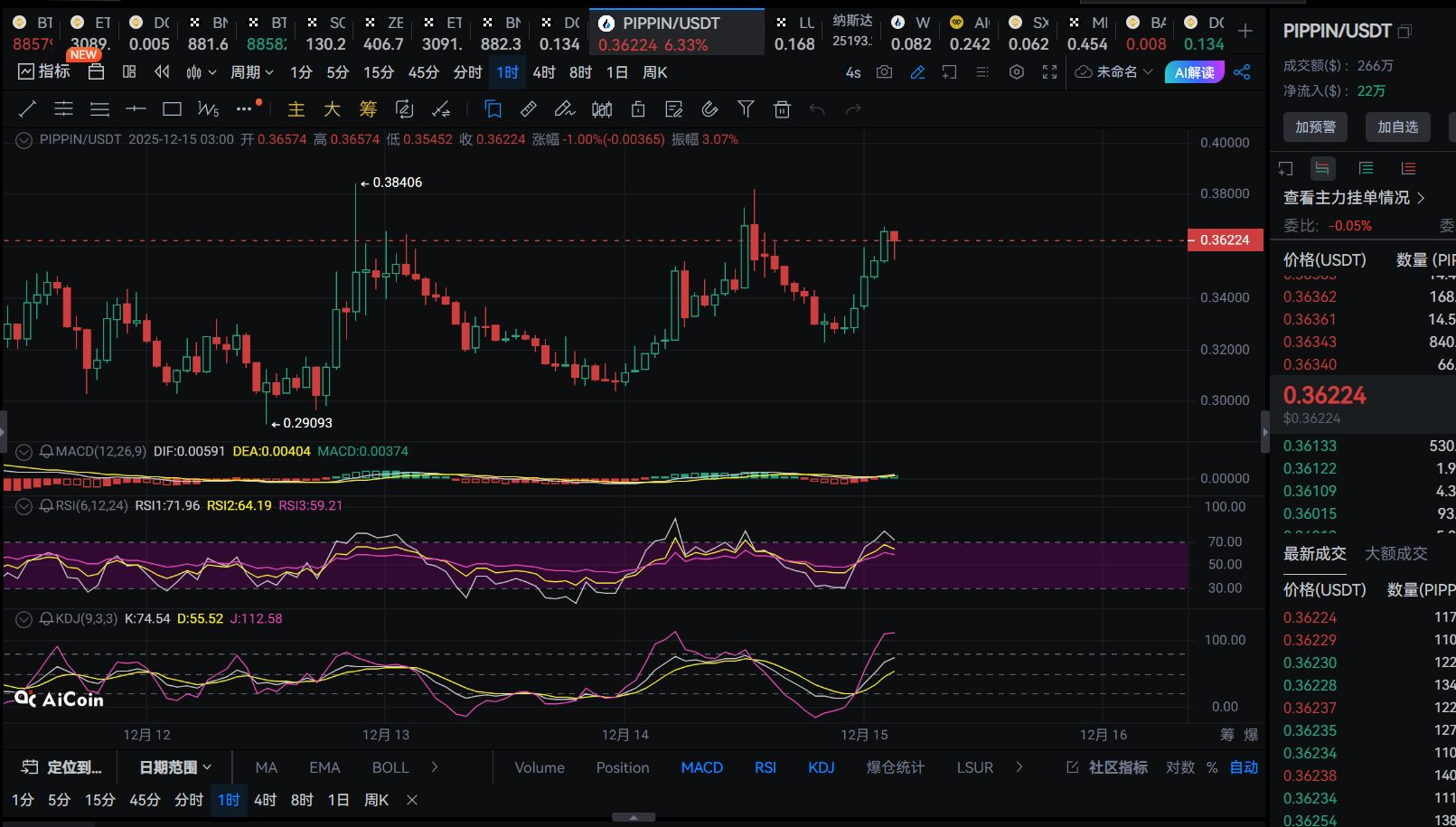 In the crypto world, one day is like a year in the human realm. If you can't understand the emotions behind the candlestick chart, you'll just end up being a harvested leek! Today, I opened the trading software and looked at the 4-hour chart of PIPPIN/USDT, and the trend looks like a roller coaster, with funds playing a 'heartbeat game' amidst the red and green. Let's dive into this candlestick and see what lies behind it!