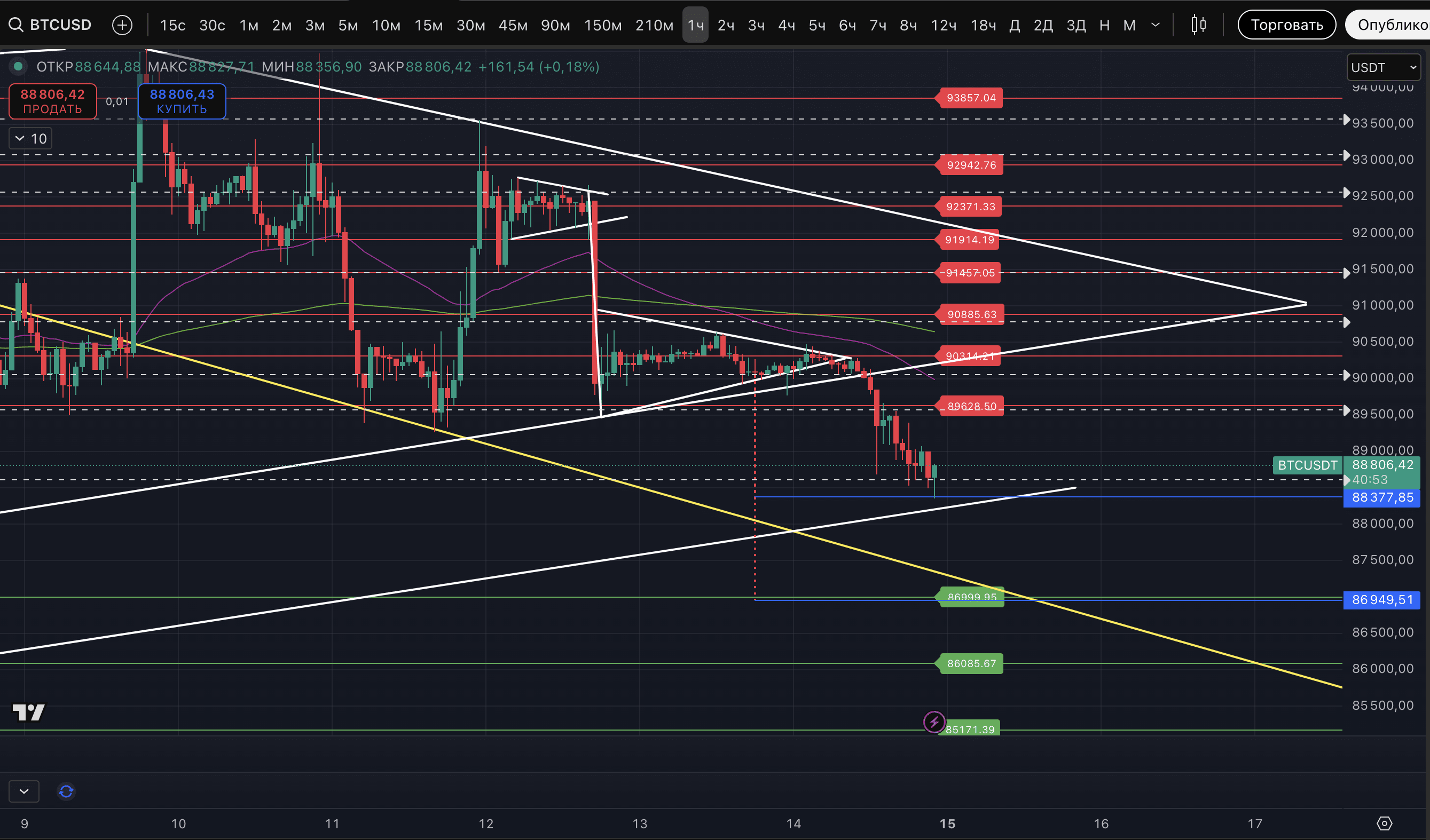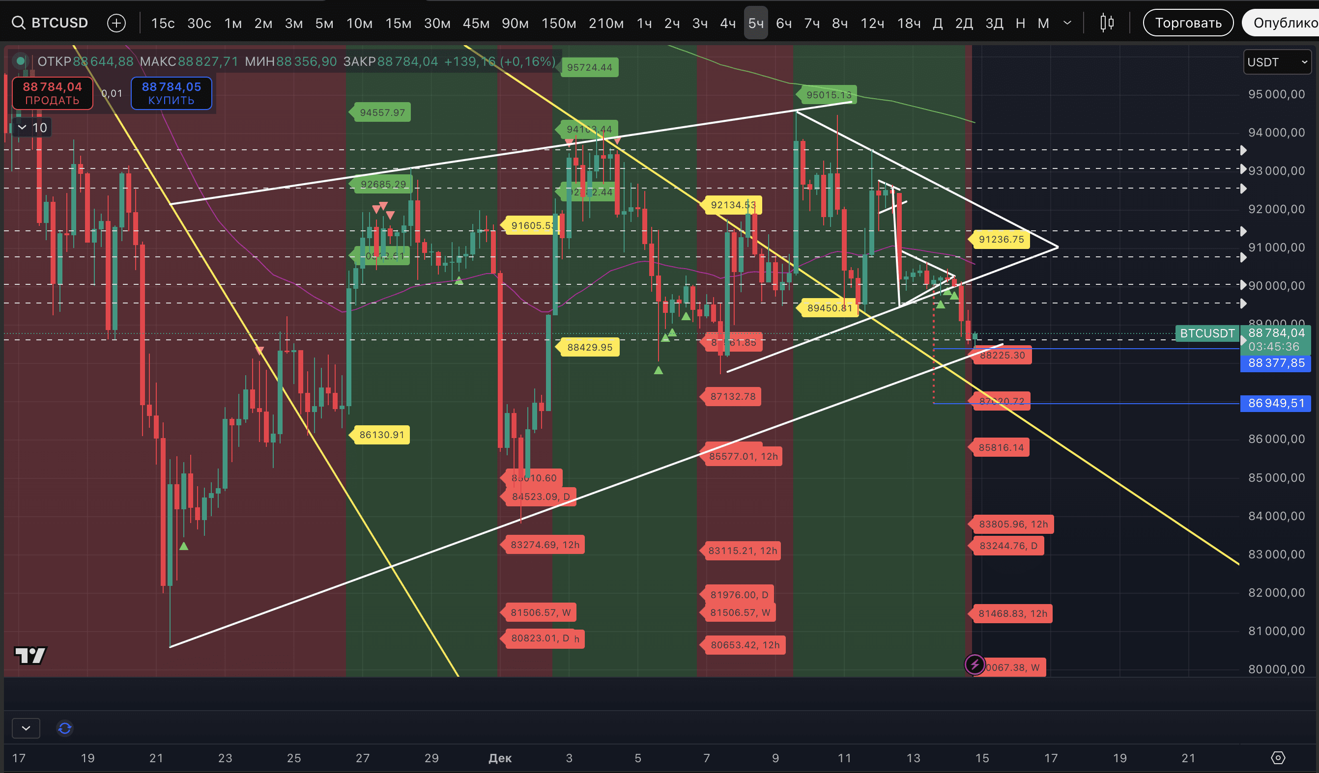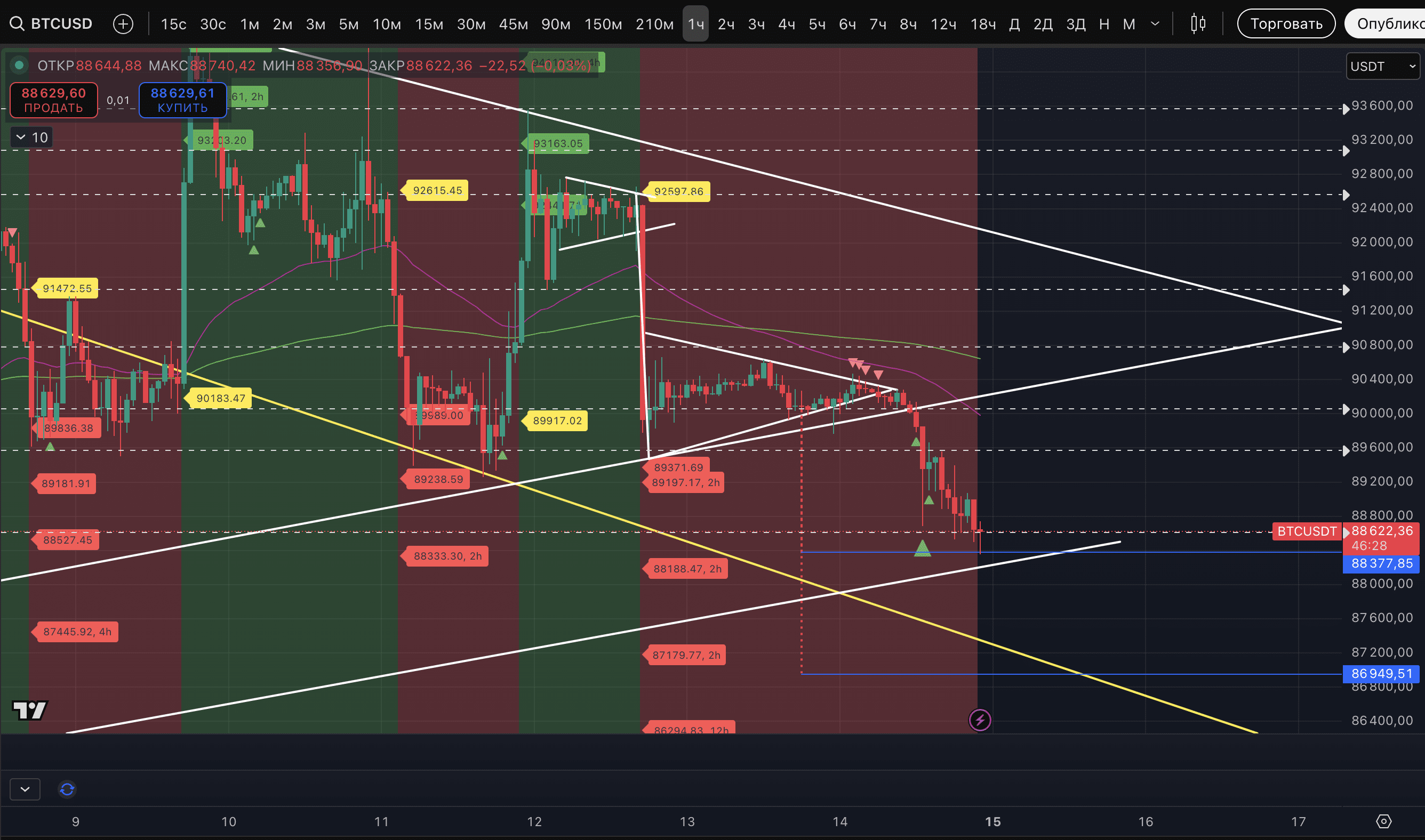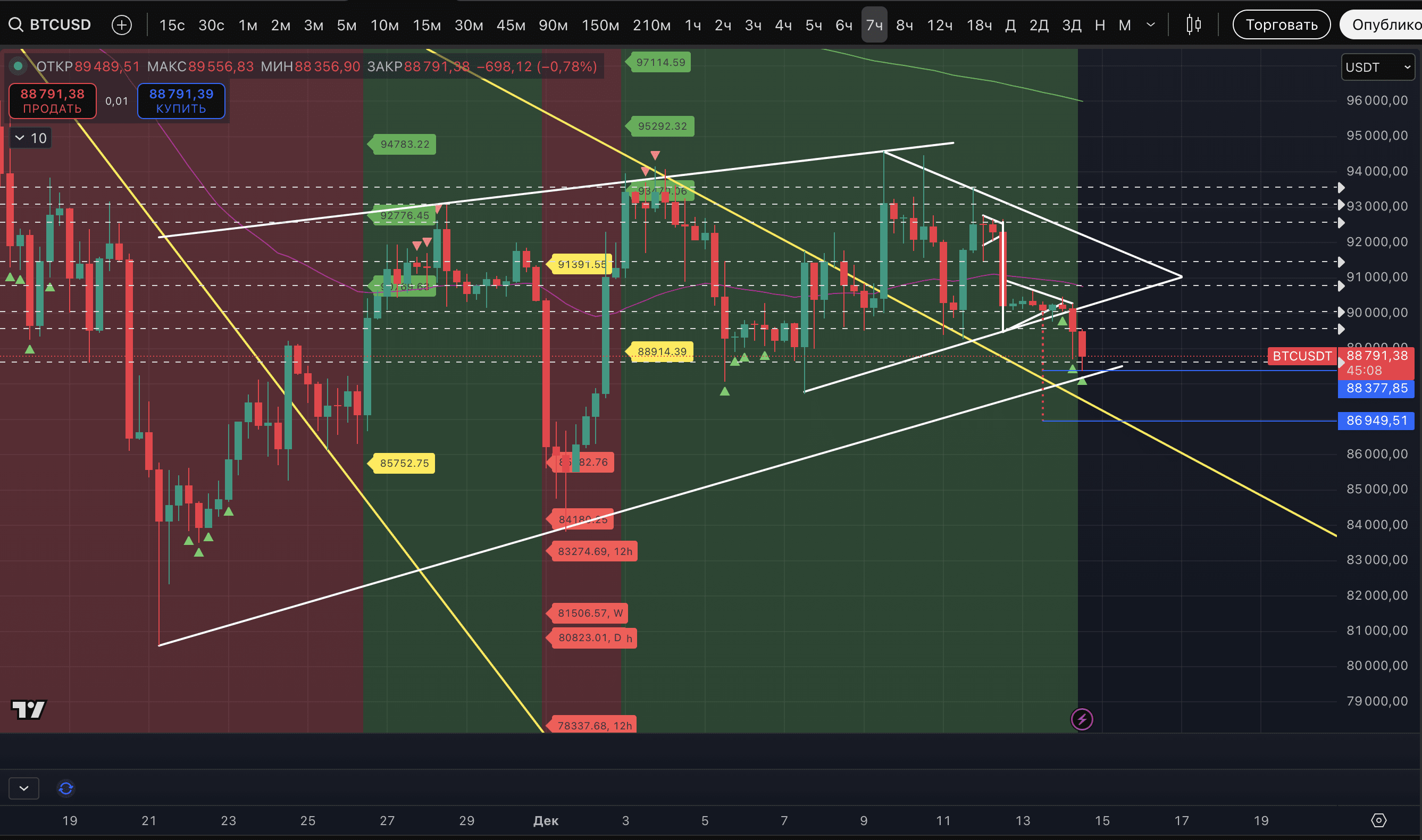 The price of #BTC has reached the first target of the pattern at $88,377. Right on it. Today, the asset showed several signals of a probable reversal, but all of them were broken. The most striking example is a Strong signal of a potential low on the hourly timeframe. We decided to wait for an uptrend on the 5-minute timeframe and ultimately did not wait for it, and the price started to trade through the shadow of the potentially reversal candle.