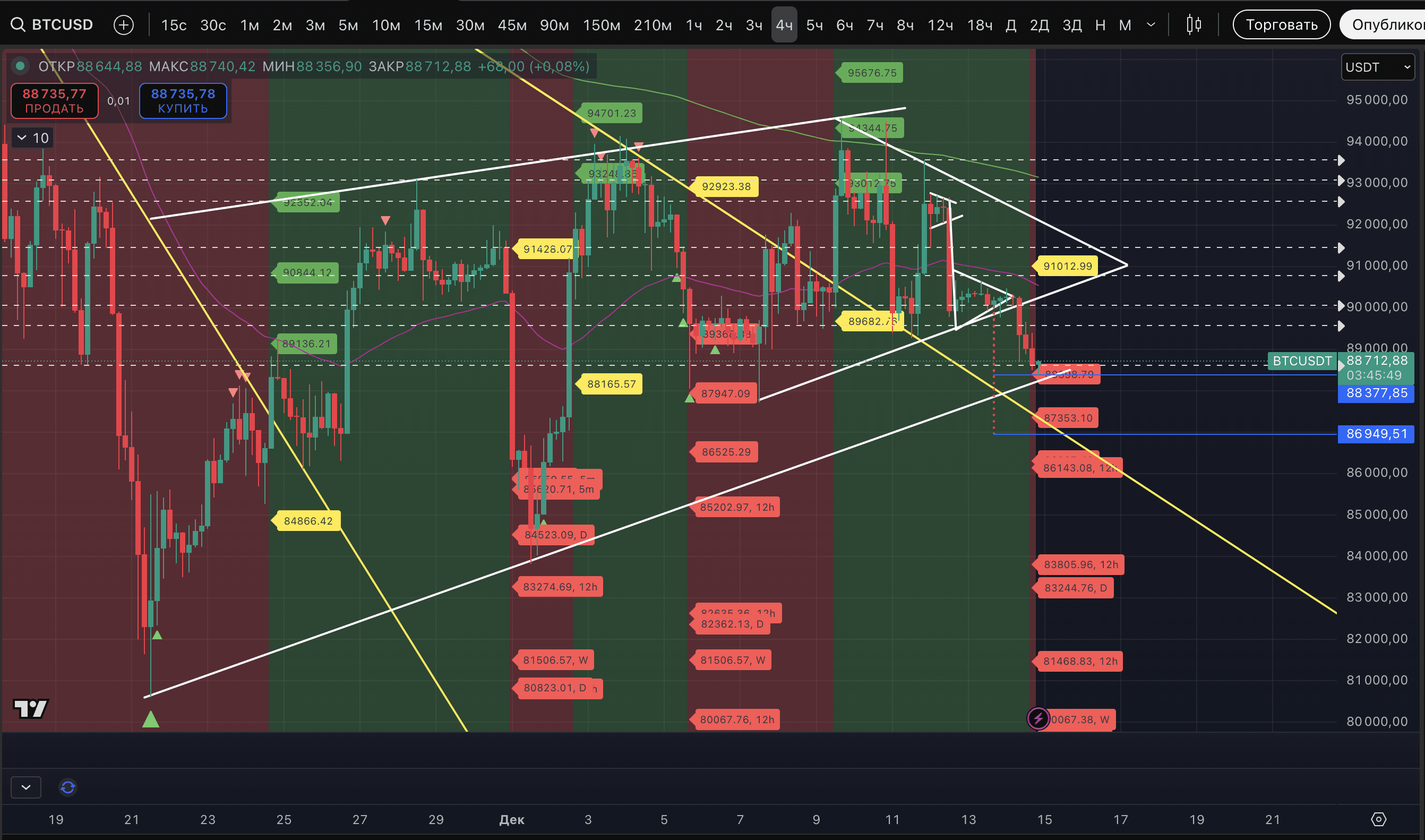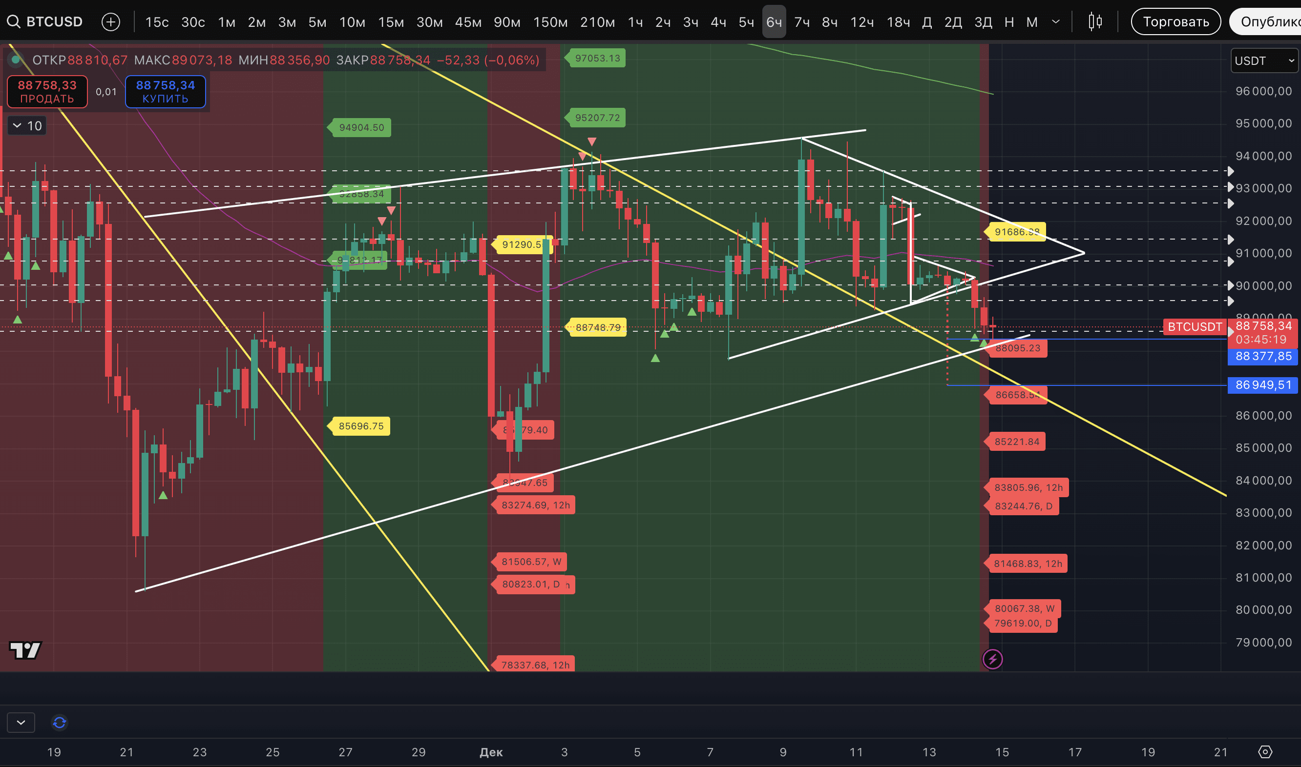 There are several signals that the correction will continue. Today, the price has entered a stable downtrend on the 4-, 5-, and 6-hour timeframes. Targets - on the screenshots. The furthest of them is at $85 221. Meanwhile, on the 6-hour timeframe, there are already three marks of potential lows, and two on the 7-hour timeframe.