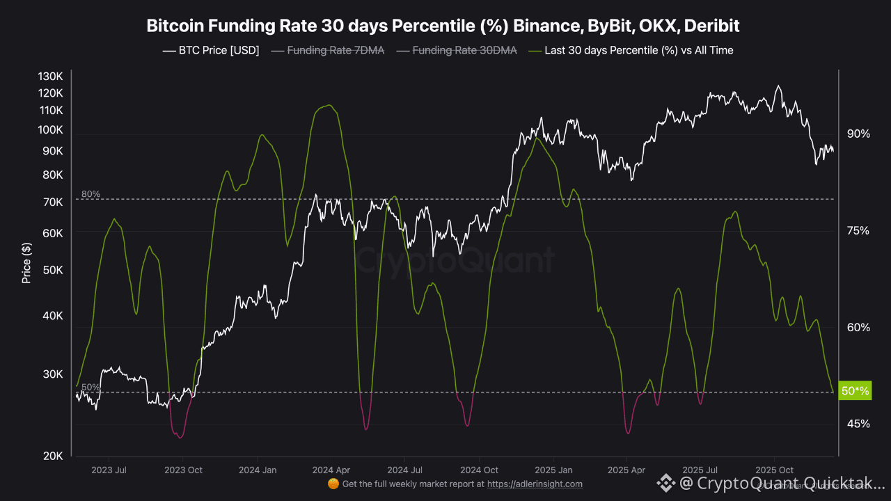 According to data from Binance, Bybit, OKX, and Deribit, Bitcoin’s 30-day funding rate percentile indicates that the market is continuing to fluctuate within a defined equilibrium range.