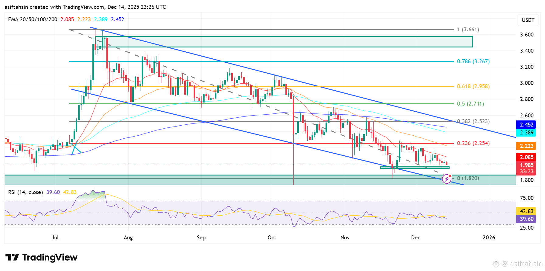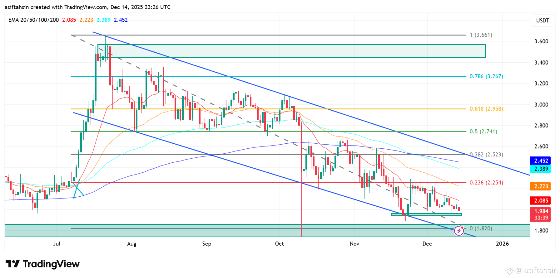 XRP is holding above a key long-term demand zone while trading inside a bearish descending channel. Although selling pressure has eased and a short-term bounce is possible, the broader structure remains bearish unless XRP reclaims the $2.50–$2.75 resistance zone with strength. A breakdown below $1.82 would expose XRP to deeper downside risk.