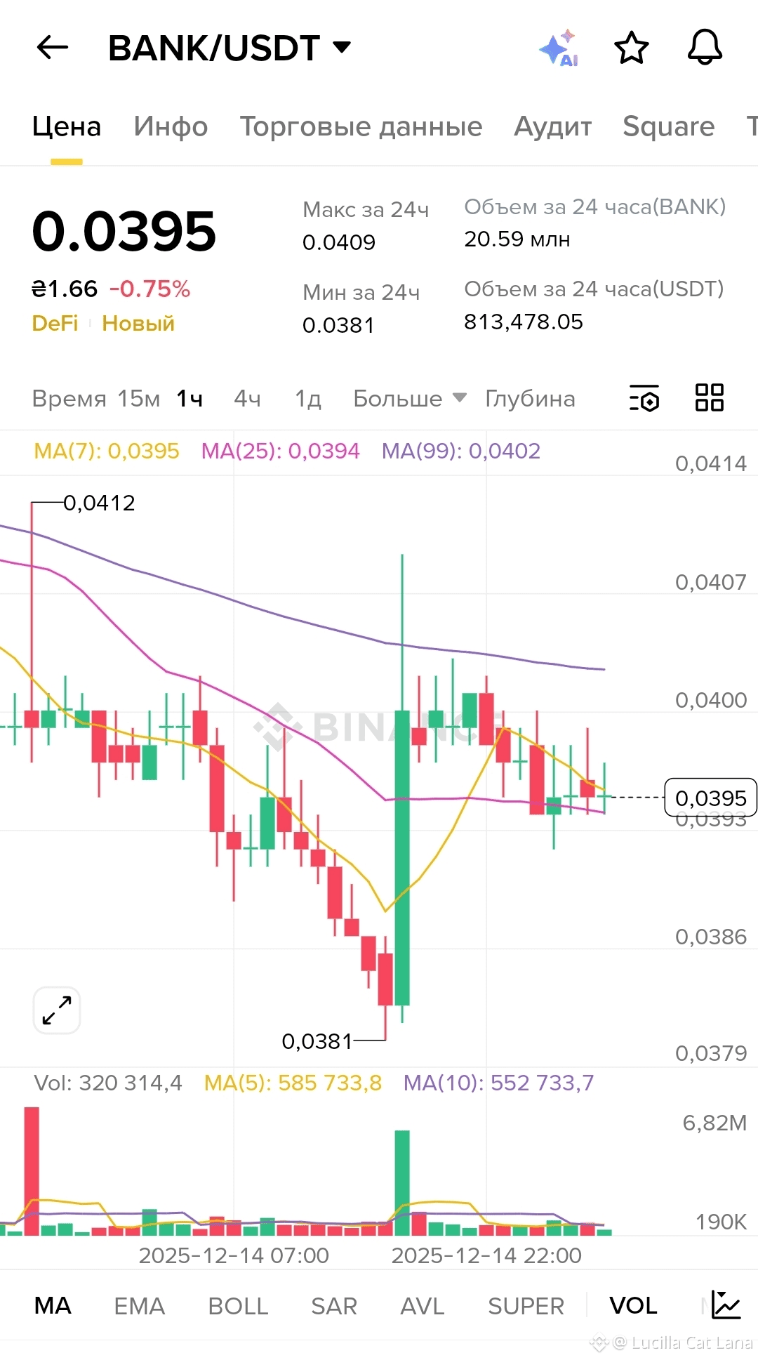 Смотрю сейчас на график $BANK и вижу картину, которая напоминает мне о важности стабильности и предсказуемости, которую дает правовая определенность. Цена сейчас $0.0395, за сутки упала на 0.75% — минимальное изменение. Максимум за 24 часа был $0.0409, минимум $0.0381 — диапазон больше 7%. Но посмотрите на общую динамику. После того резкого падения к $0.0381 (та большая зеленая свеча в центре графика показывает мощное восстановление от этого минимума) цена консолидируется в узком диапазоне $0.0393-$0.0400. Справа на графике видна серия маленьких свечей с небольшими телами — классическая консолидация после волатильного движения. Для проекта, который строит долгосрочный бизнес с учетом регулирования, такая стабилизация после шока — хороший знак.