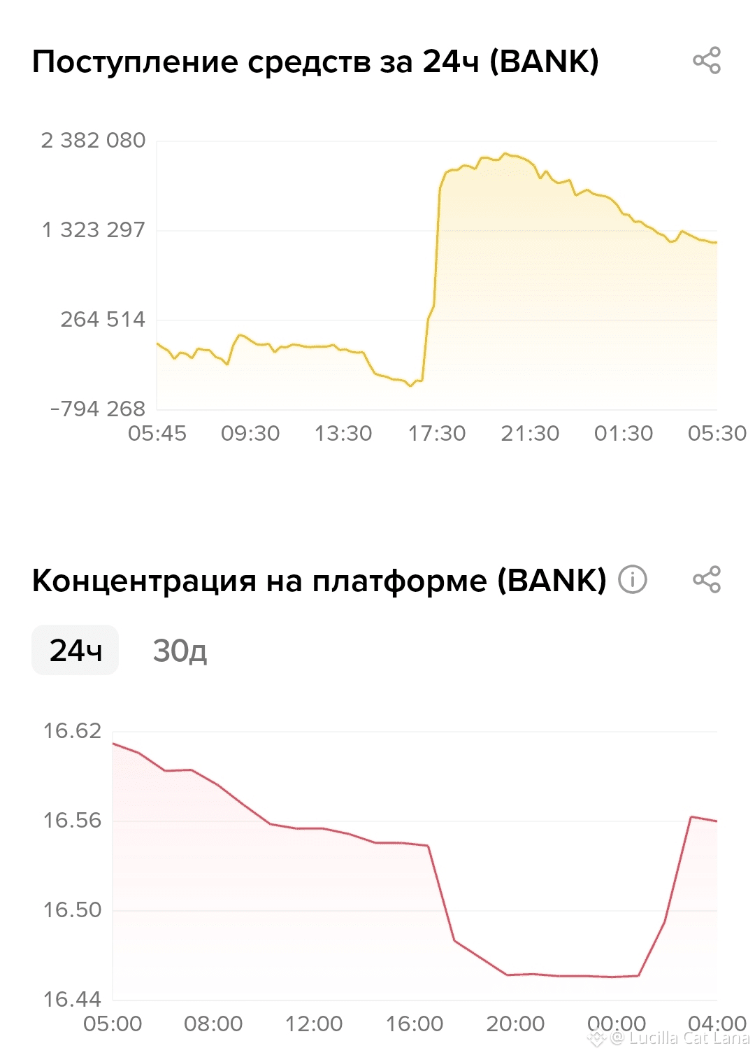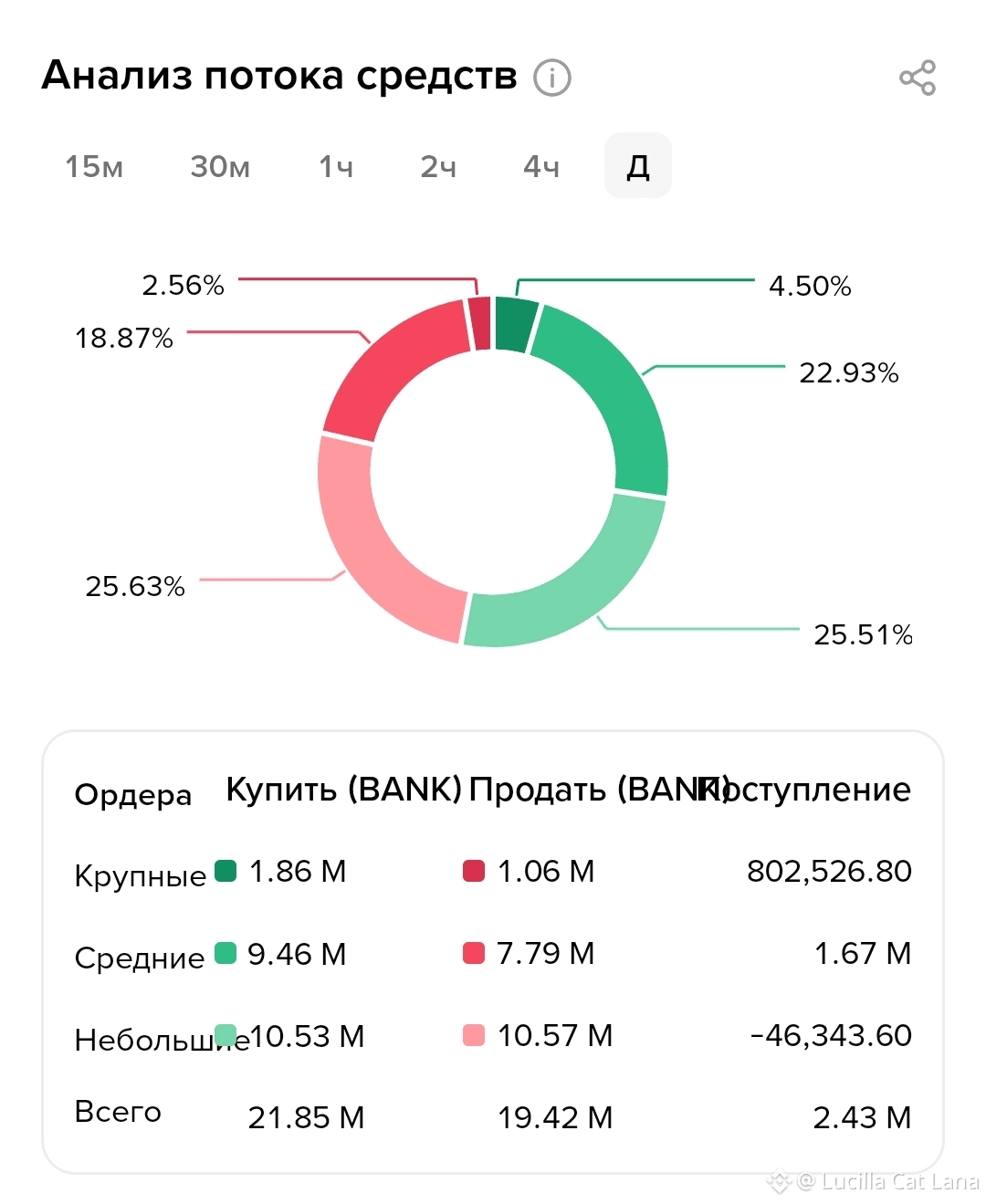 Объемы торгов показывают снижение активности после волатильного периода. За сутки 20.59 миллионов BANK и 813 тысяч USDT. График объемов внизу показывает два значительных спайка — большой красный столбик слева (паническая продажа) и огромный зеленый столбик в центре (агрессивная покупка на дне около 6.82 миллионов). После этих экстремумов объемы упали и торгуются на низких уровнях справа. MA(5) по объему — 585 тысяч, MA(10) — 552 тысячи. Это низкая активность, показывающая, что рынок в режиме ожидания. Для регулируемых финансовых продуктов стабильные, предсказуемые объемы предпочтительнее резких спайков.