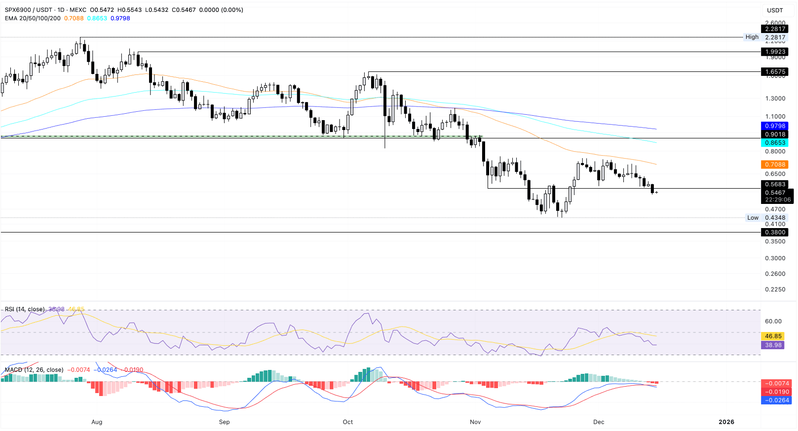 As of the time of writing on Monday, the trading price of SPX6900 has already fallen below $0.55, down 7% the previous day. The downward trend of SPX is approaching $0.50; if it closes below this level, it may continue to drop to the low of November at $0.4348.