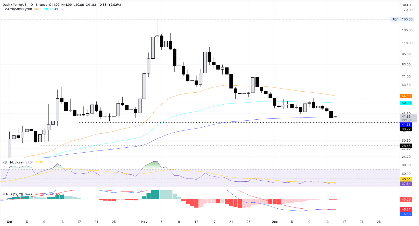 As of the time of writing on Monday, Dash has risen slightly by 2%, with the price close to the 200-day exponential moving average (EMA) of $41.58. This rebound during the day came after three consecutive trading days of decline, indicating that there is still demand for support at the moving averages in the market.