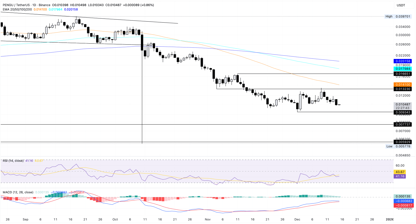As of the time of writing on Monday, PENGU has temporarily held the psychological level of $0.01000, a drop of 8% the previous day. However, on Tuesday it failed to hold the low of November 4 at $0.01323, and the price continued to decline.