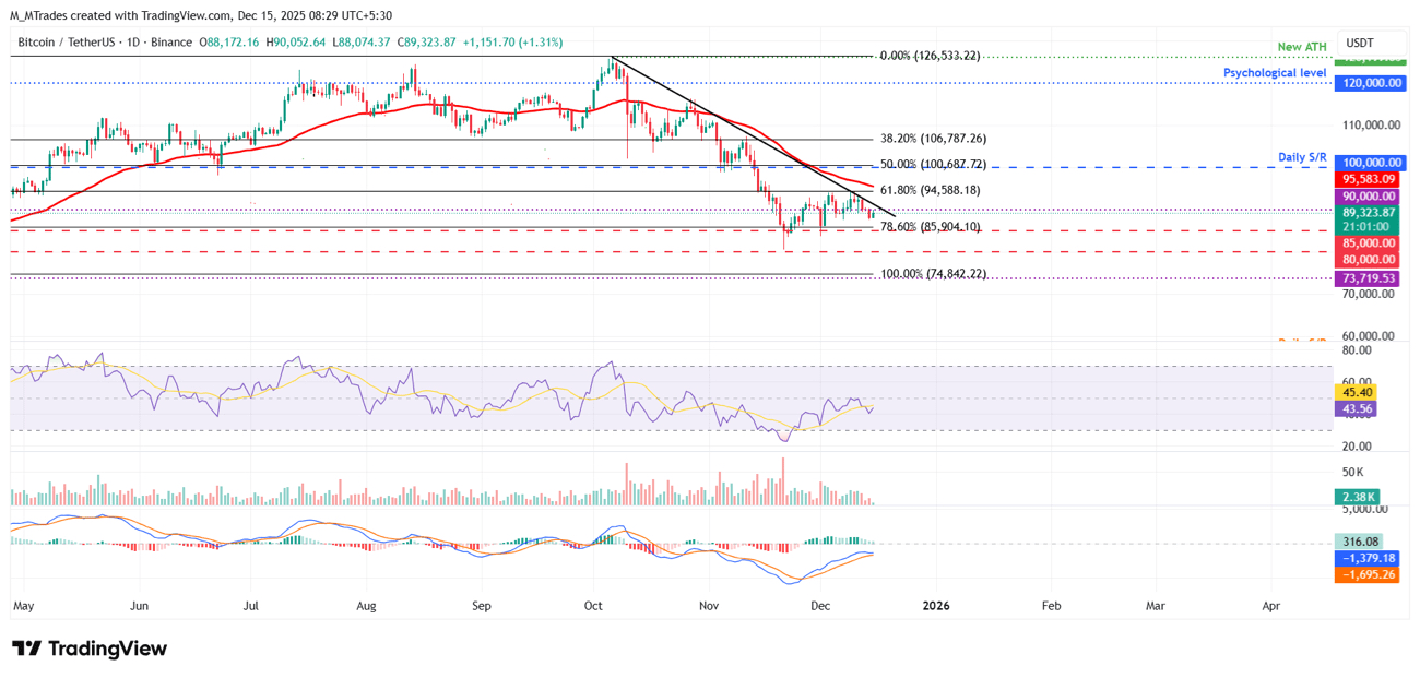 The price of Bitcoin is trading around $89,000 on Monday after failing to break above the descending trend line last week.