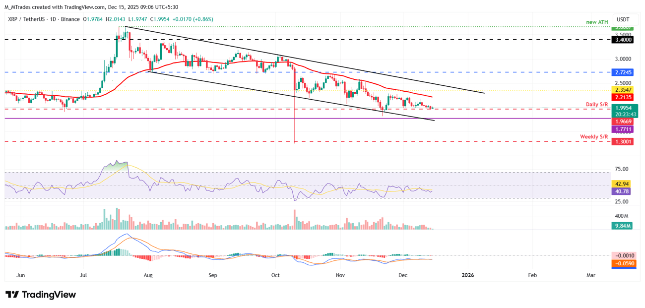 The price of XRP has decreased for the second consecutive week by 3.22%, with a retest of the key daily support at $1.96 on Sunday. As of this report on Monday, XRP is trading around $1.99.