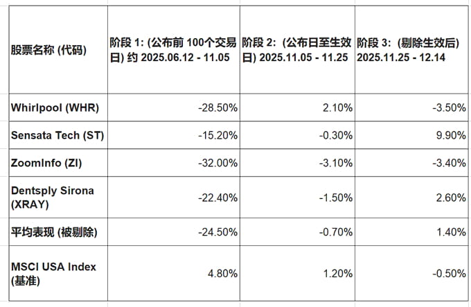 当 MSCI 正式宣布剔除名单时,股价表现反而平稳,平均跌幅仅为 0.7%。甚至如 Whirlpool (WHR) 这样的个股,在公告后反而出现了 2.1% 的反弹。